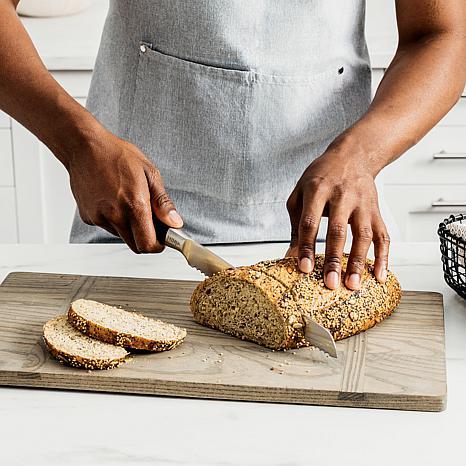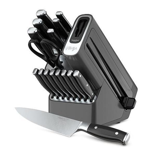 Ninja Foodi NeverDull Premium Knife System 17 Piece Set Introducing the Ninja Foodi NeverDull Premium Knife System, the premium knives that stay razor-sharp for over 10 years. With a few swipes of the built-in foolproof sharpener, this all-in-one system maintains the superior sharp edge you crave. Premium blades forged from German stainless steel are rust-resistant and strong enough for all your kitchen tasks. Superior sharp edge easily glides through tough ingredients with a razor-sharp cutting angle. Chopping and slicing have never been easier. Ergonomic, chef-approved design is perfectly balanced for comfort and control, so the knife feels like an extension of your hand. Durable, wear-resistant handle includes a full-tang construction for a professional weight-in-hand. NeverDull Technology is conveniently built into the storage block for professional sharpening results that will maintain a razor-sharp edge for over 10 years.  What You Get (1) 8" Chef knife (1) 8" Bread knife (1) 7" Santoku knife (1) 8" Slicing knife (1) 6" Boning knife (1) 5" Utility knife (1) 3.5" Paring knife (8) Steak knives (1) Shears (1) Knife block with NeverDull Technology