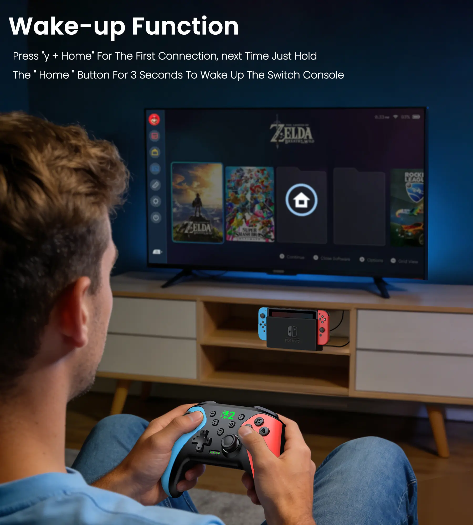 【Wake-up Function & Gyro Sensor】 The Switch Pro controller also includes a wake-up function – simply press the "HOME" button to wake your Switch console from sleep mode.