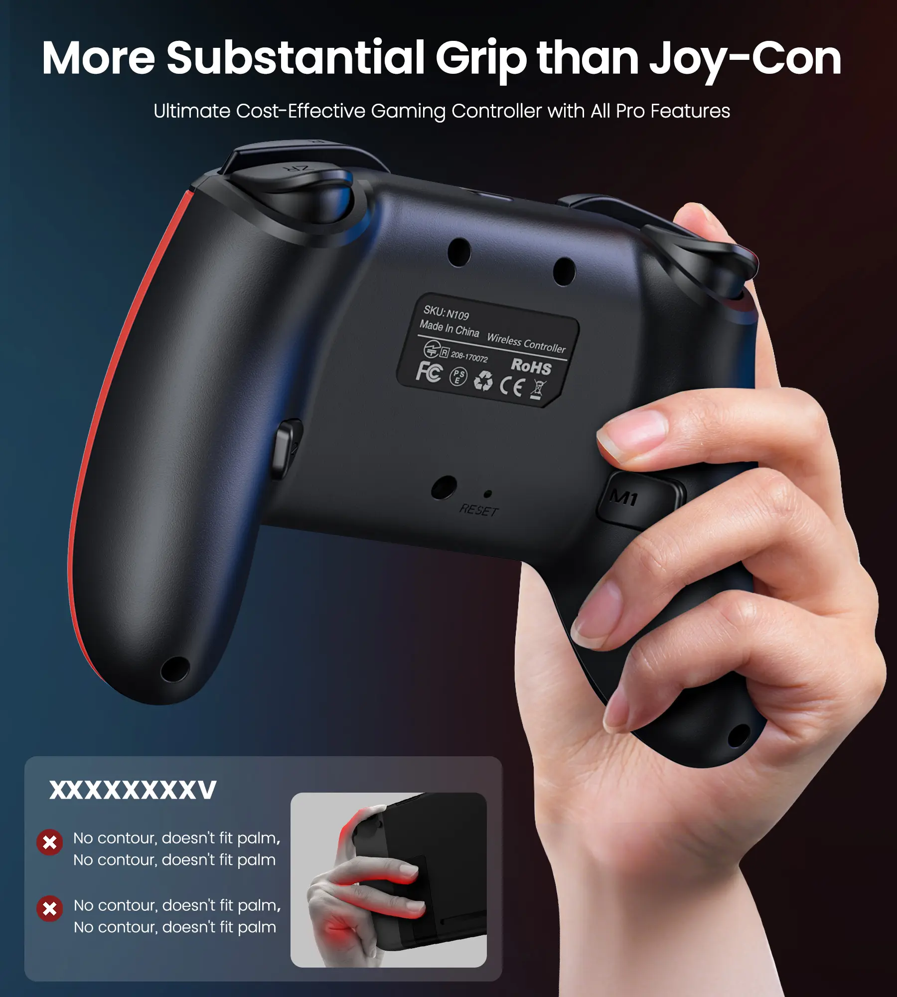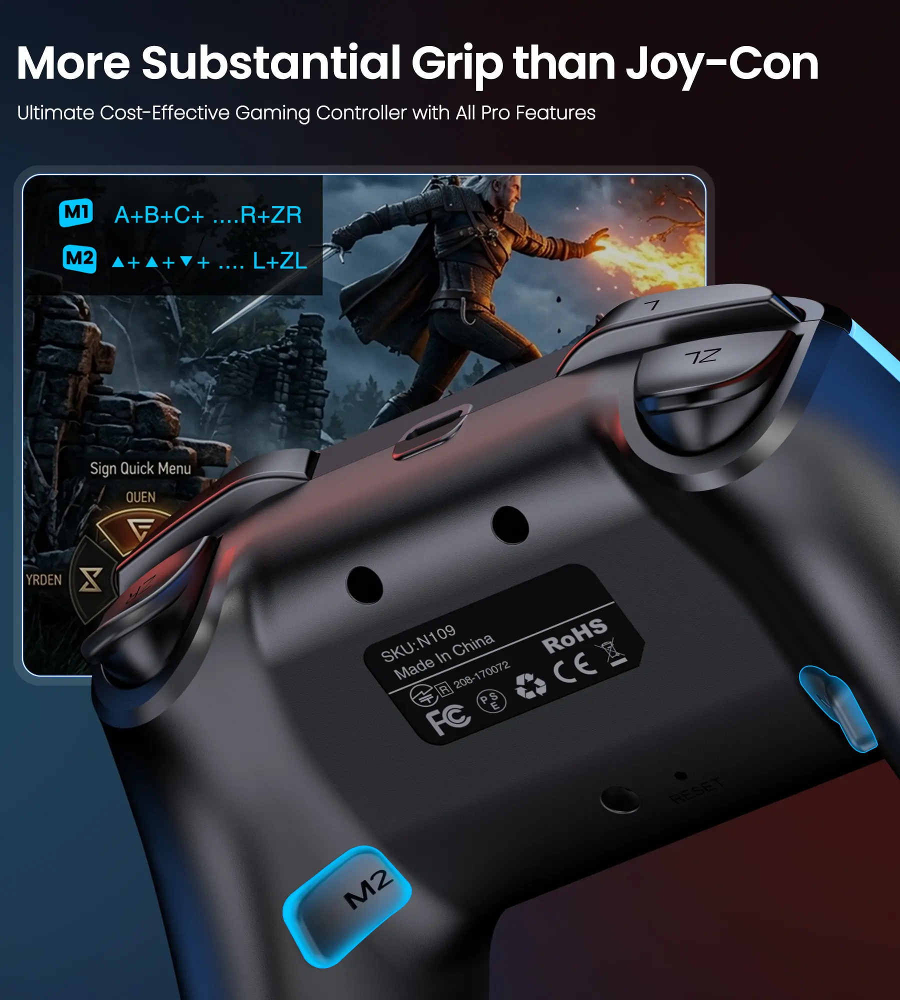 【Custom Macro Function】 Equipped with macro-programming functionality on the back, this Switch controller allows you to pre-set complex command sequences and execute them with a single button press.
