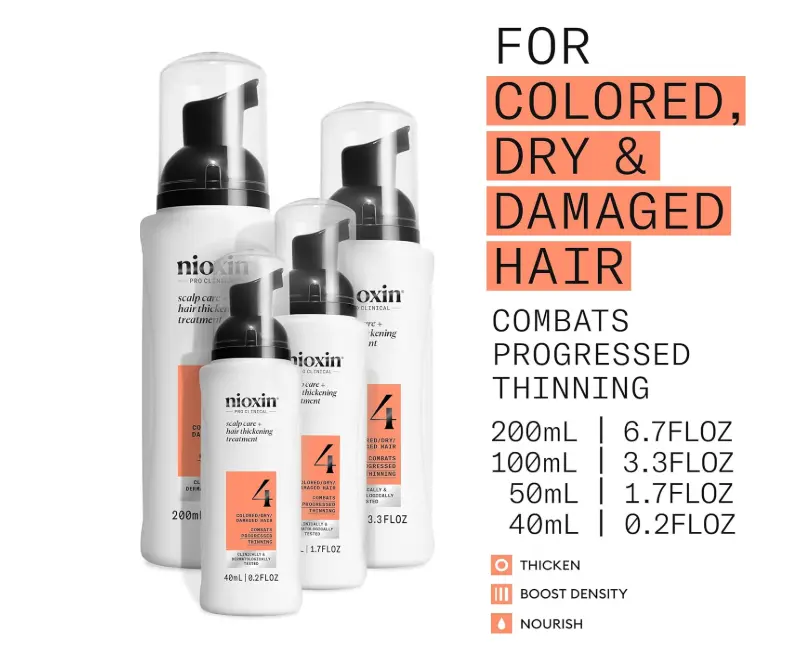 Introducing the Nioxin System 4 Scalp Care + Hair Thickening Treatment, your ultimate solution for fuller, thicker-looking hair. This groundbreaking product is specially designed to address the unique needs of color-treated hair that is noticeably thinning. With Nioxin System 4, you can say goodbye to lifeless locks and hello to voluminous, luscious hair. This advanced treatment is formulated with a complex blend of essential nutrients, botanicals, and antioxidants to revitalize your hair from root to tip. Thicker, Fuller Hair: Say goodbye to thinning hair and hello to a head full of luxurious, voluminous locks. Nioxin System 4 works deep within your scalp to stimulate hair growth and promote thicker, fuller hair. Color Protection: Don't let your hair color fade away. This scalp care treatment is specifically formulated for color-treated hair, helping to protect and preserve your vibrant hair color for longer-lasting results. Experience the transformative power of Nioxin System 4 and regain your confidence with every strand. This lightweight formula is easy to use and absorbs quickly into your scalp, leaving no greasy residue behind. Simply apply the treatment directly onto your scalp and massage gently for optimal absorption. With consistent use, you'll notice a significant improvement in your hair's texture, thickness, and overall fullness. Get ready to turn heads and unleash your hair's potential with Nioxin System 4 Scalp Care + Hair Thickening Treatment.