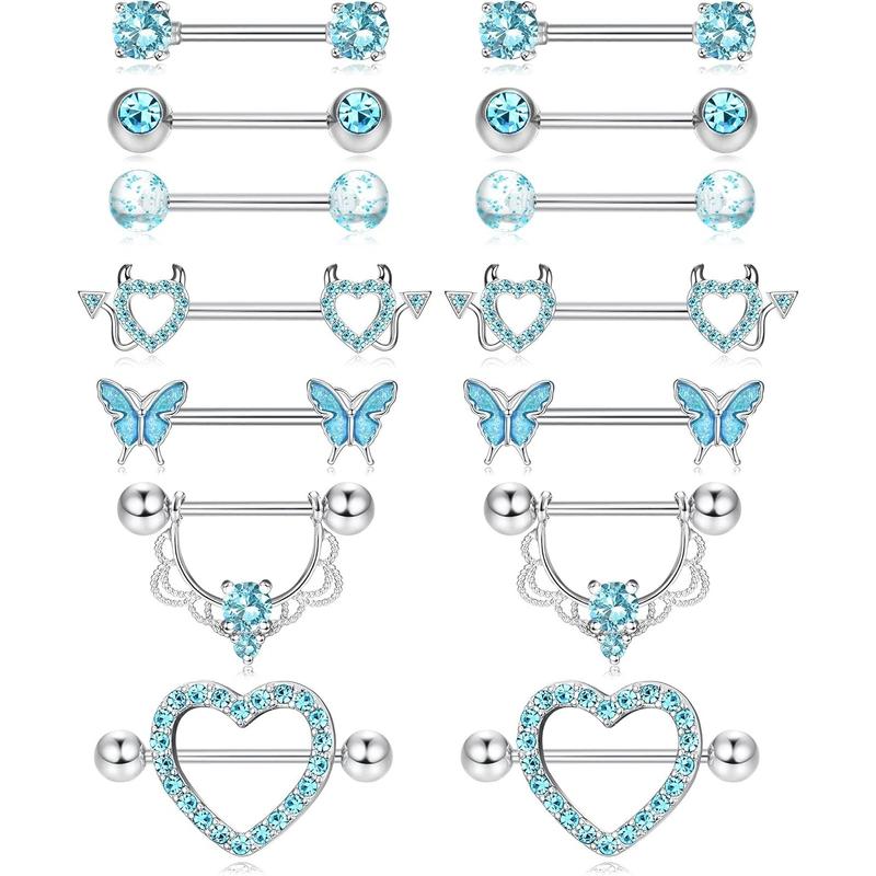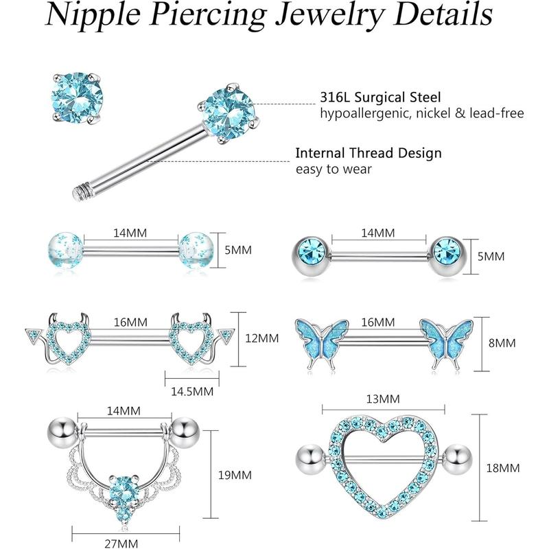 ·Variety Nipple Rings Set: Your order includes a collection of 7 pairs of nipple rings, featuring an assortment of designs such as hearts, butterflies, evil-themed, adorned with cubic zirconia (CZ), and balls.