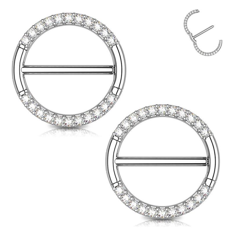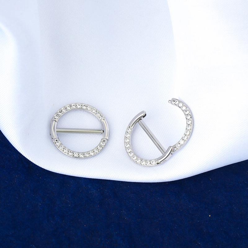 It features a simple circular, inlaid with clear accents, also a straight wearable bar at the center of the circular. The overall look is ultra-luxe and stylish. It also features a non-removable, hinged segment that makes insertion and removal a snap. It's definitely the most user-friendly nipple shield jewelry you have ever seen!