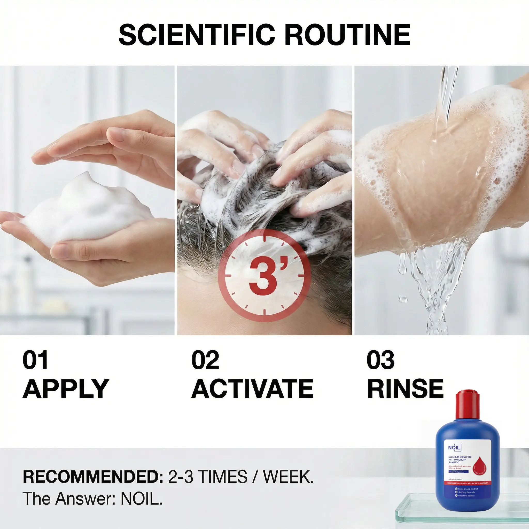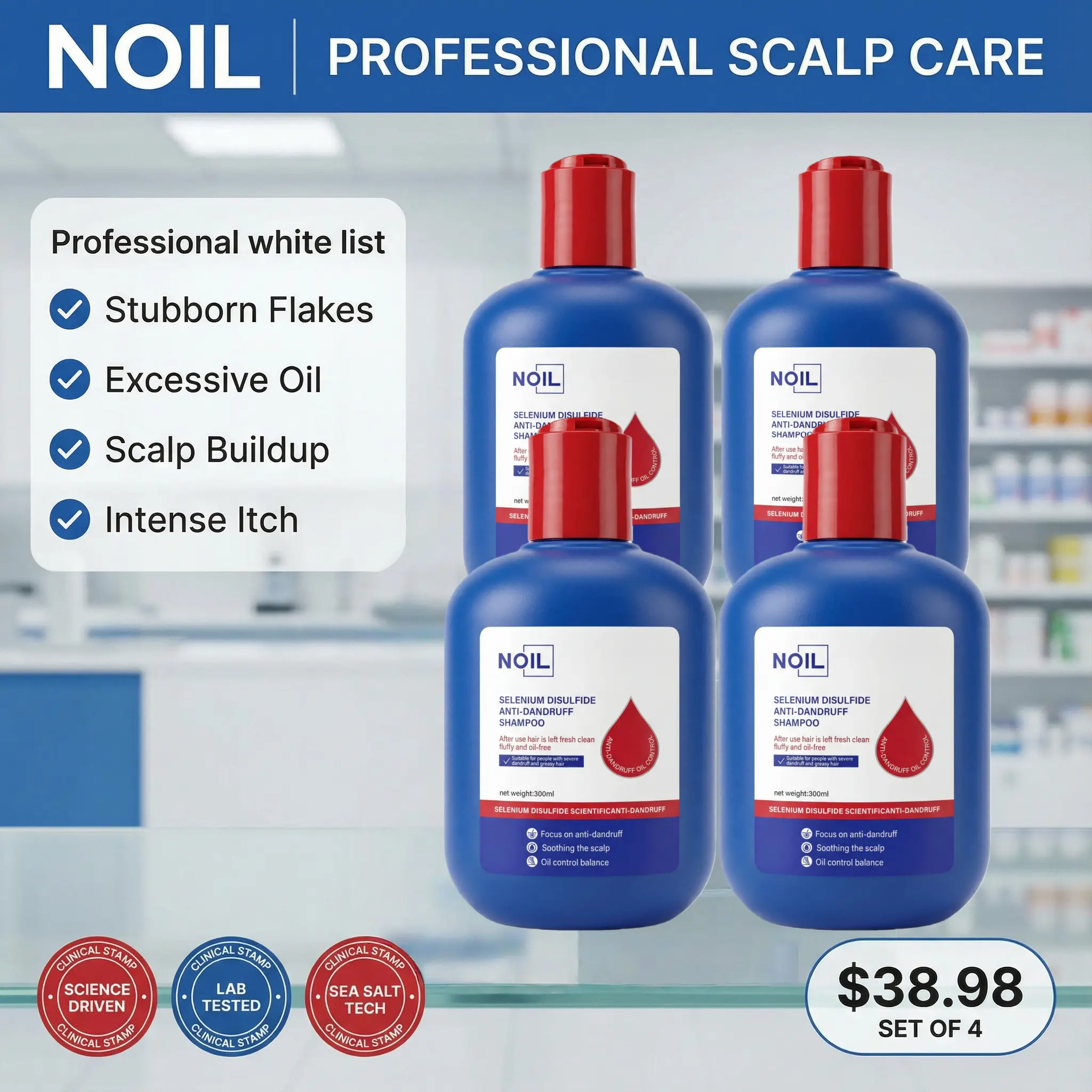 NOIL's dermatologist-developed formula combines 0.5% Selenium Disulfide with natural Sea Salt. This 4-pack ensures long-lasting scalp health, perfect for shared daily care. The dual-active formula eliminates Malassezia fungus, soothes irritation, and prevents dandruff recurrence.