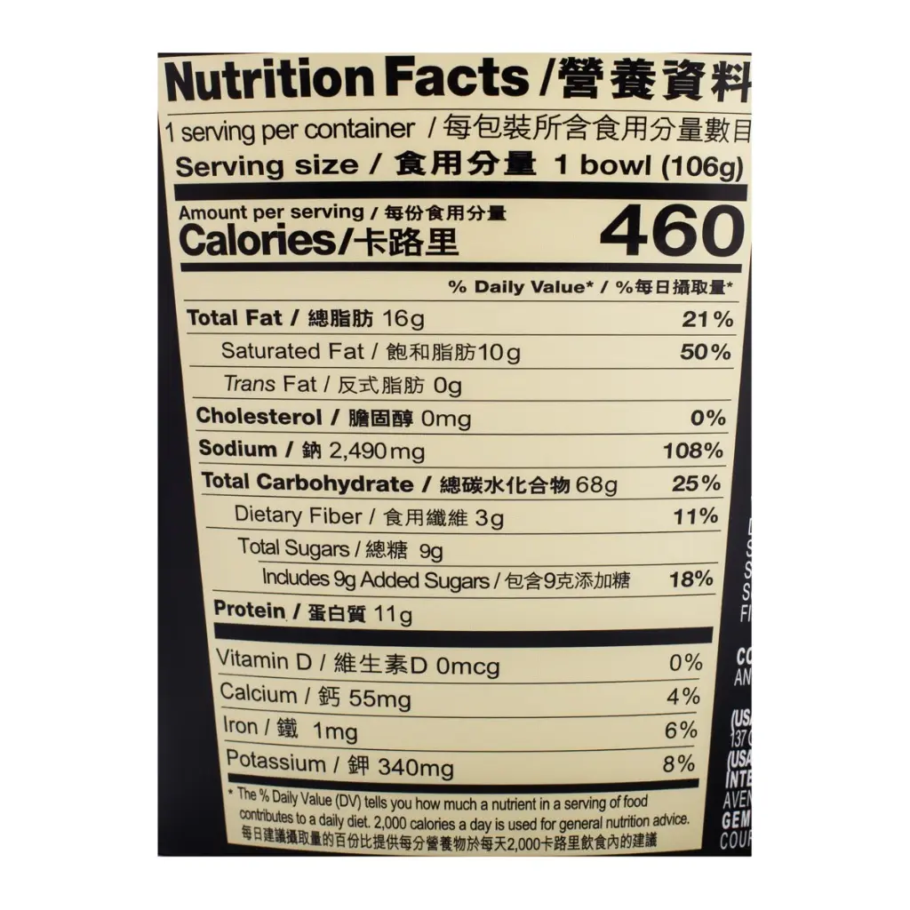 Amount Per Serving: Calories 460, Total Fat 16g (21% DV), Saturated Fat 10g (50% DV), Trans Fat 0g, Cholesterol 0mg (0% DV), Sodium 2490mg (108% DV), Total Carbohydrate 68g (25% DV), Dietary Fiber 3g (11% DV), Total Sugars 9g (Includes 9g Added Sugars (18% DV)), Protein 11g, Vitamin D 0mcg (0% DV), Calcium 55mg (4% DV), Iron 1mg (6% DV), Potassium 340mg (8% DV).
