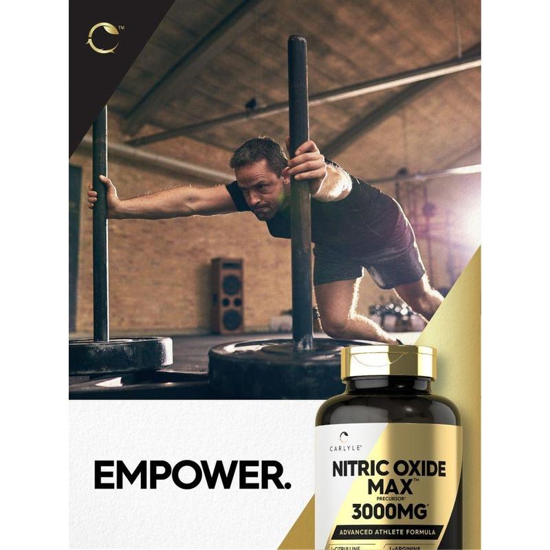 Experience Carlyle's Nitric Oxide Max, designed for pre or post workout! Our advanced athlete formula features 2,000 mg L-Citrulline, and 1,000 mg L-Arginine per serving in quick release capsules.