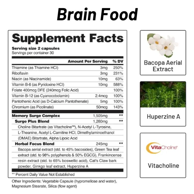 Directions For Brain Food: Take 2 capsules daily with water or as advised by a health professional.