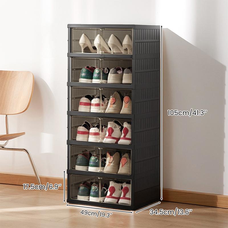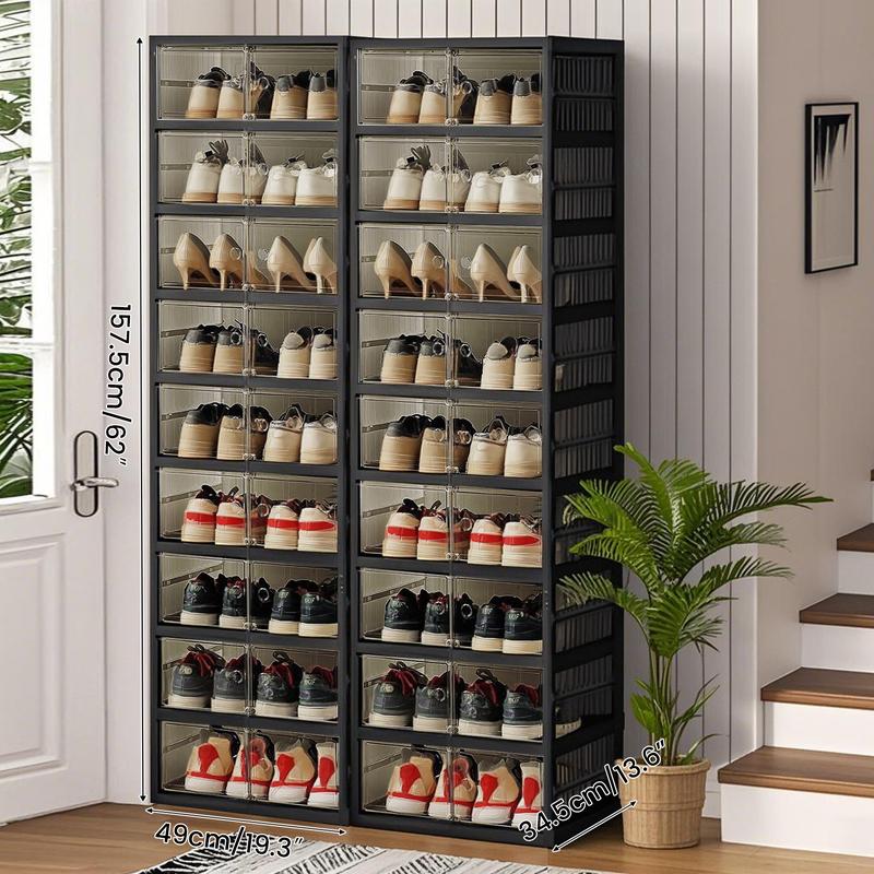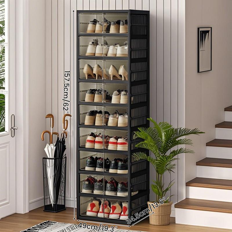 This 9-tier shoe rack, designed with NLDD’s one-piece snap-together system, sets up instantly—no tools needed. The sleek, stackable design assembles in minutes and folds flat for ultra-compact storage, saving space. Holds up to 18 pairs of shoes, ideal for men’s (size 15), women’s, boots, sneakers, and heels.