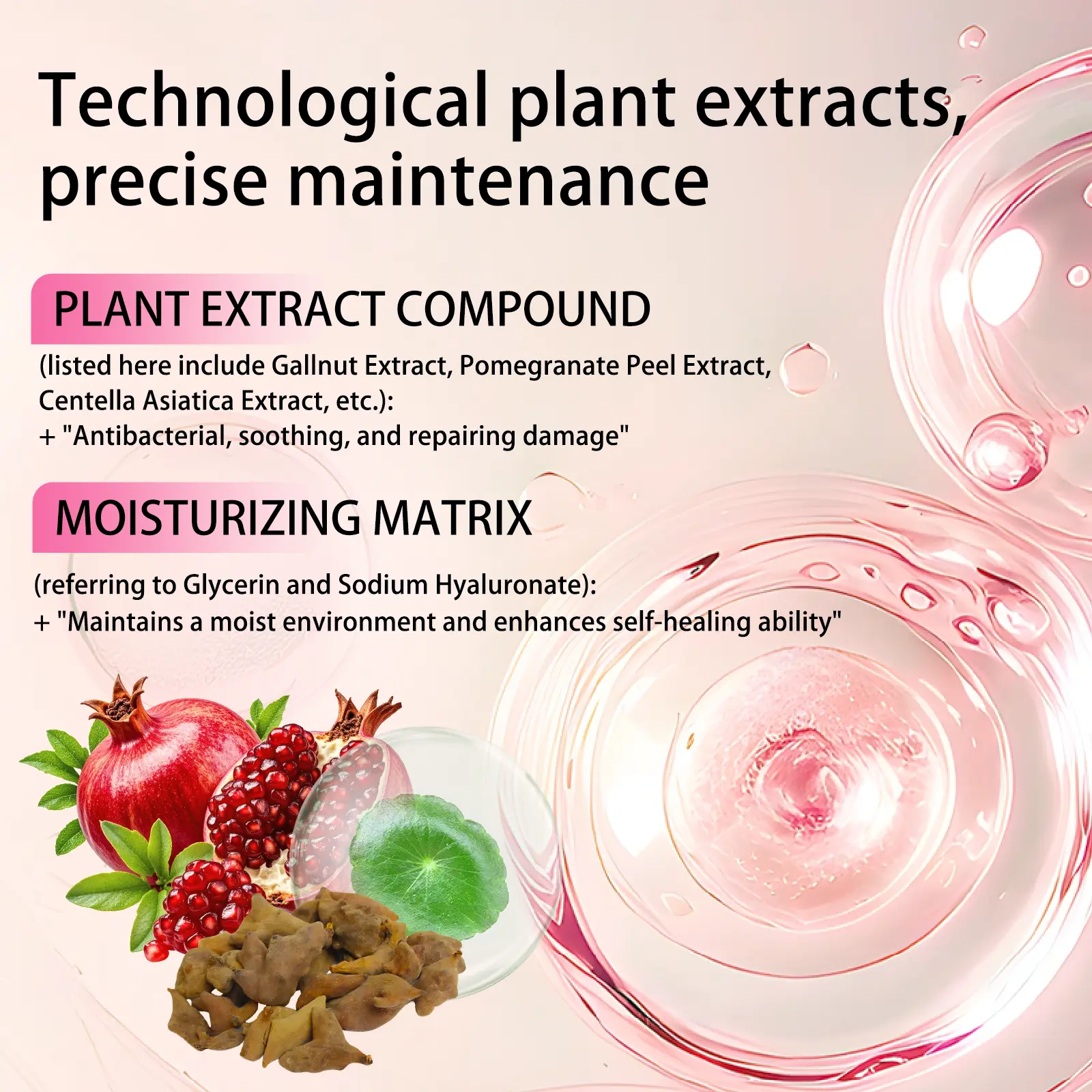 • 【Soothing Plant Complex】: Selected extracts of gallnut, pomegranate peel, centella asiatica, etc., help soothe the skin and maintain a clean environment.