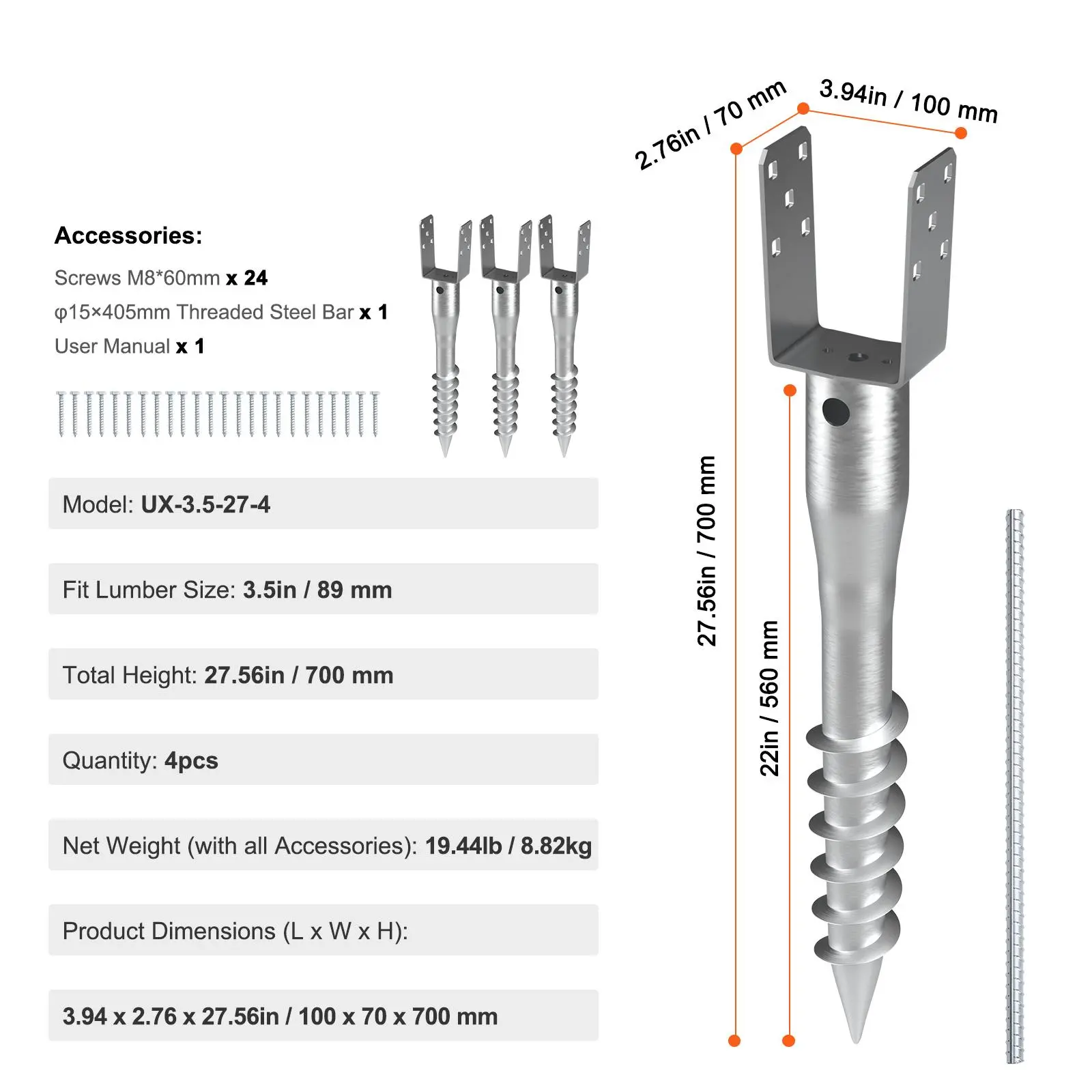 • Suitable for 3.5” Timber: The semi-enclosed spike has a total height of 27.56 inches and a nail length of 22 inches, suitable for 3.5-inch timber, providing excellent support.