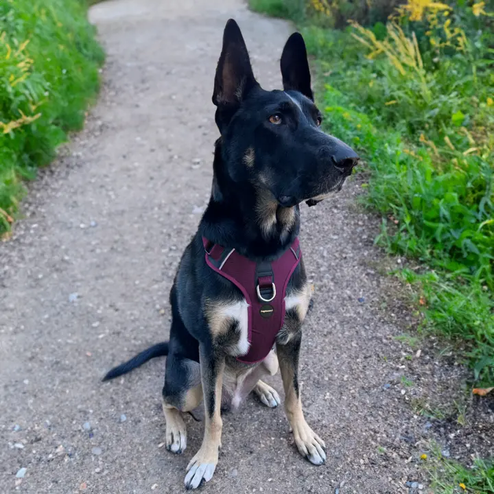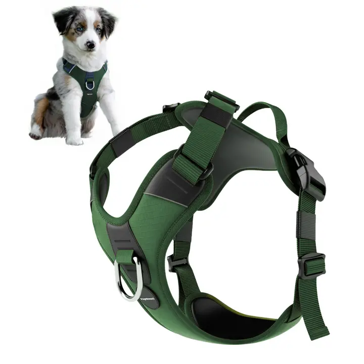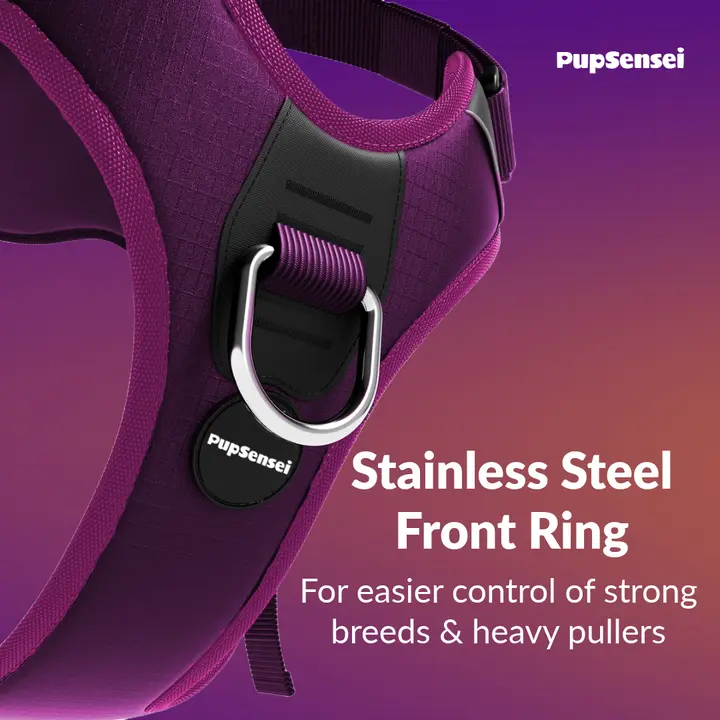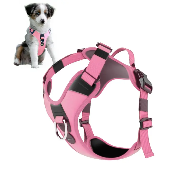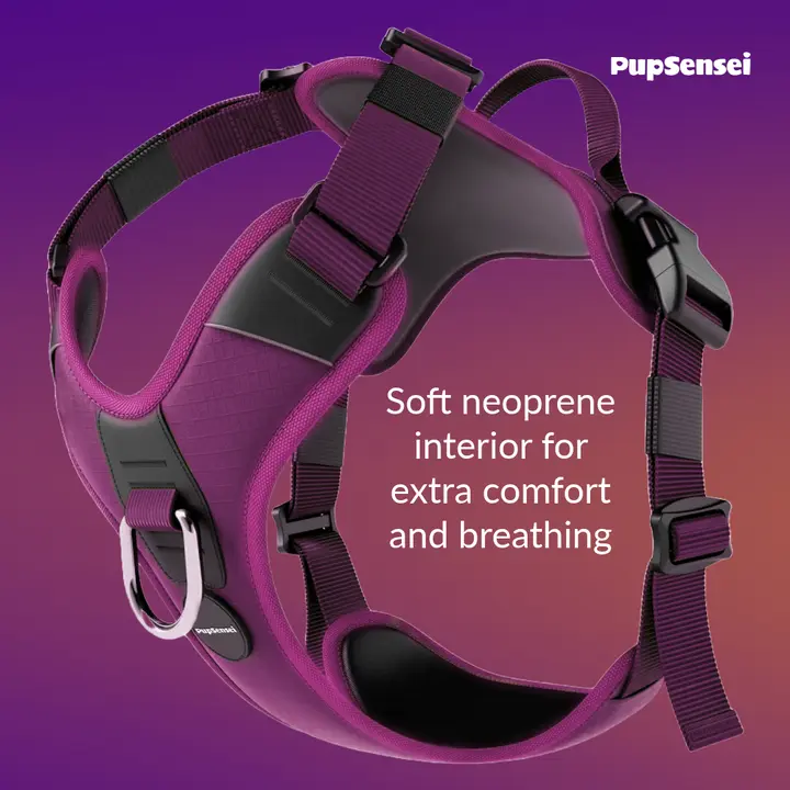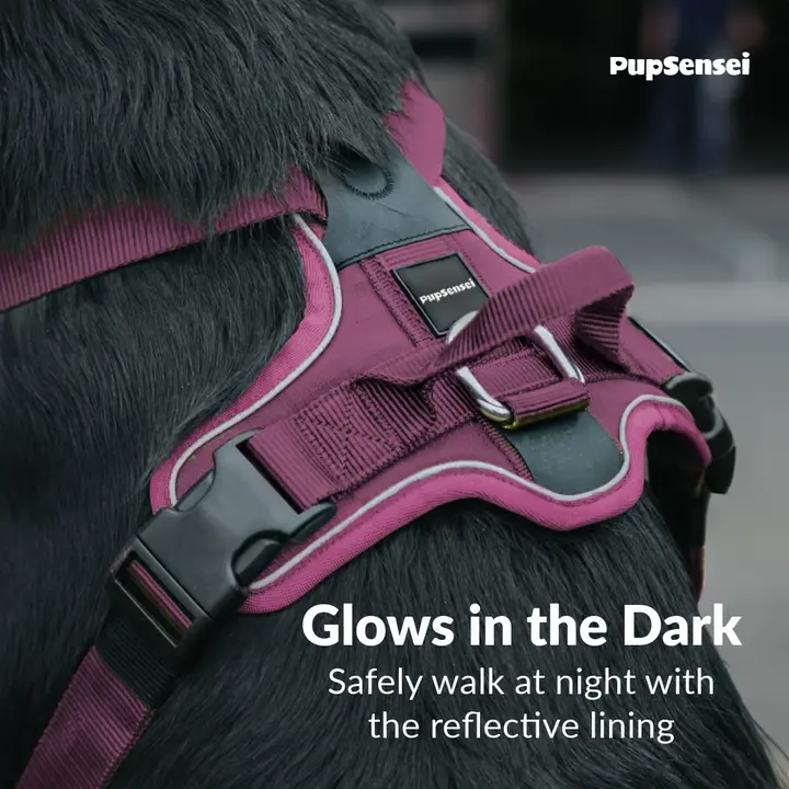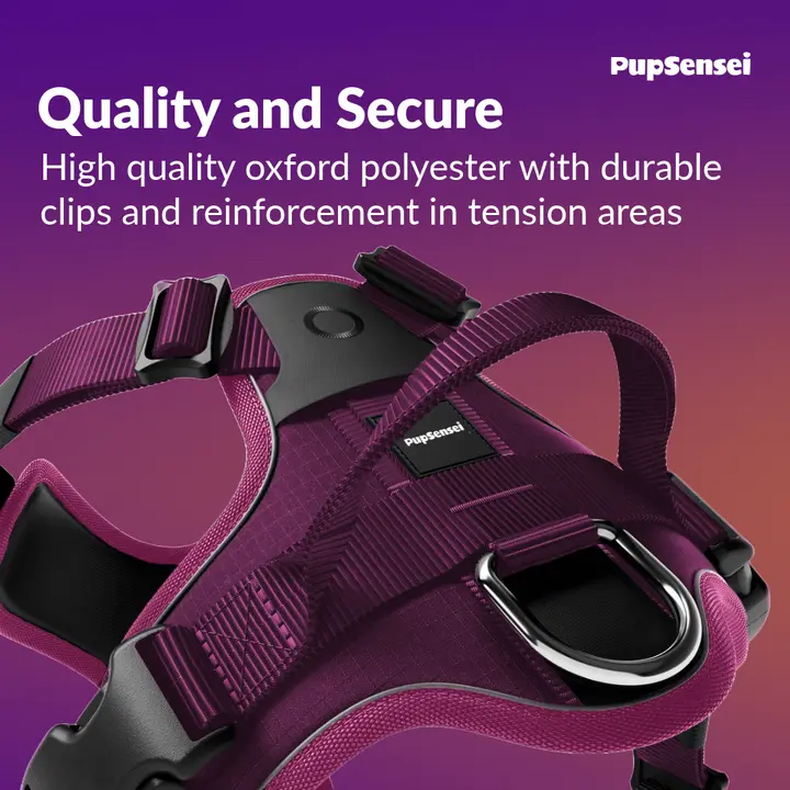 The No-Pull Dog Harness features a front anti-pull loop to reduce pulling and improve control during walks, making it perfect for training both puppies and adult dogs. Additionally, the harness is made with tear-resistant oxford polyester and soft neoprene lining for all-day comfort and lasting durability, ensuring it can withstand daily use. It also includes two lead attachment points (front and back) and a sturdy rear handle for maximum control in any situation. With convenient side-release clips, the harness is quick and easy to put on and take off, simplifying everyday use. Moreover, reflective strips provide enhanced visibility in low-light conditions, keeping your dog safer on nighttime walks. The harness also features stainless steel hardware for rust-free reliability.