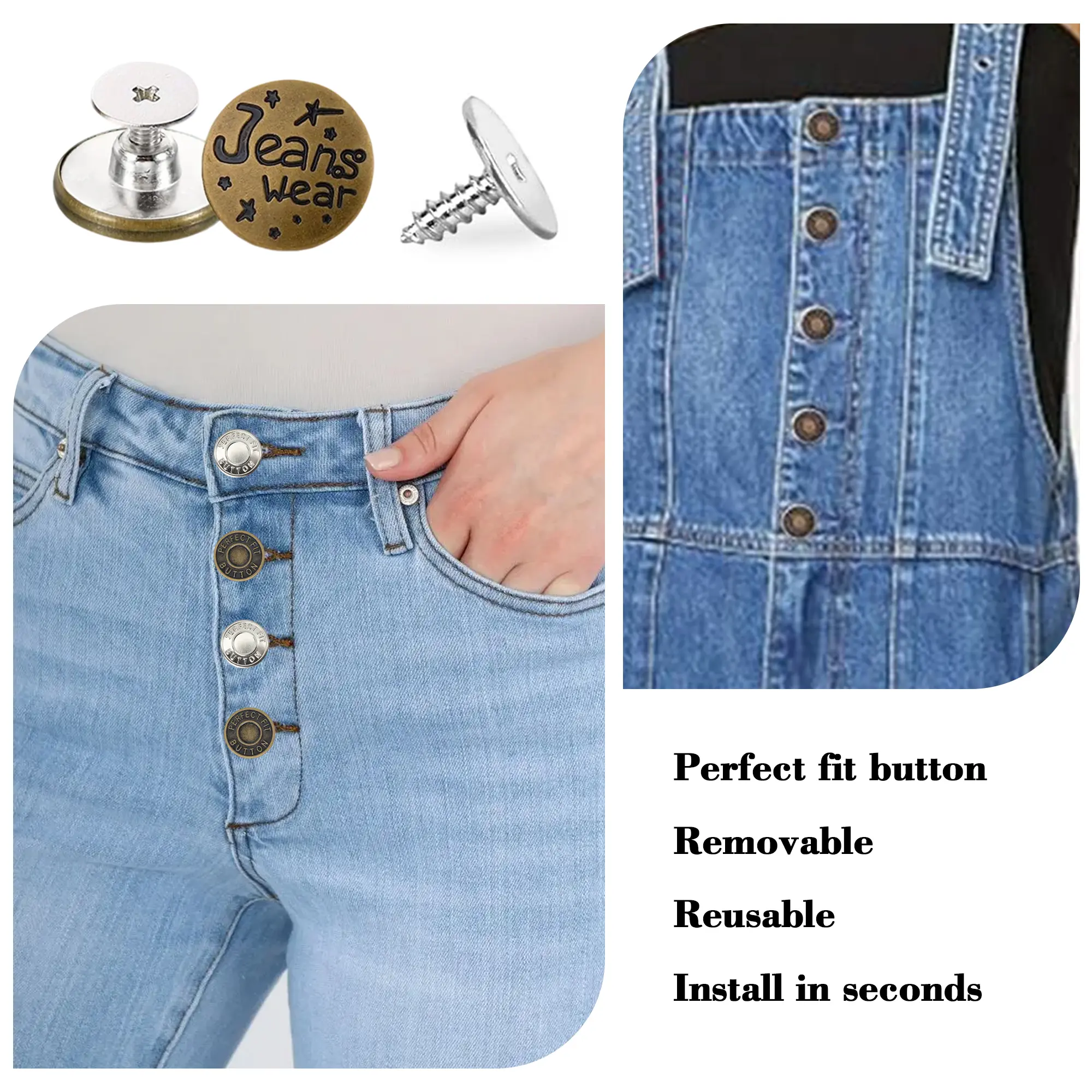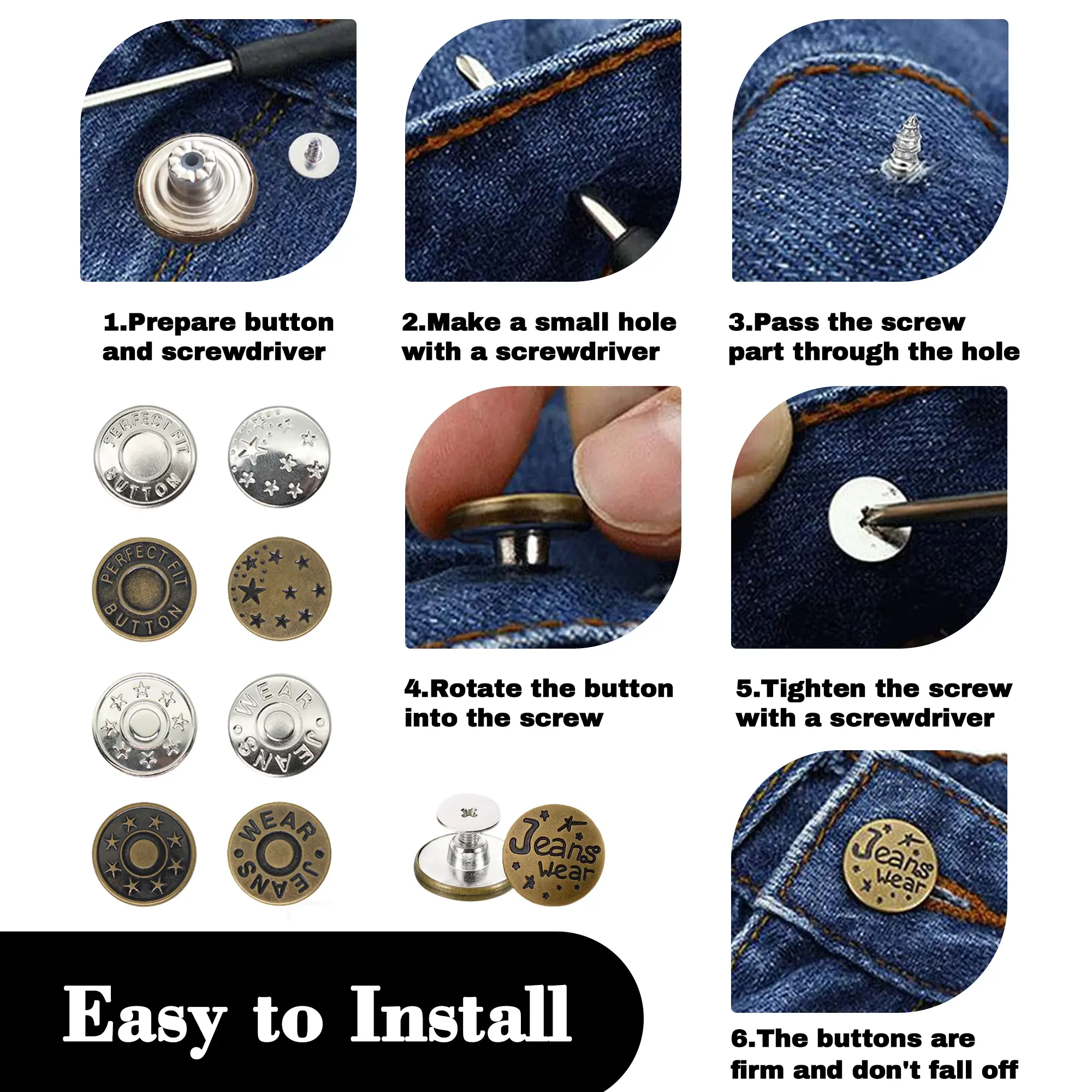 Easy Installation - Just place a hole and pass the replacement jean button through the fabric and attach the base, then easily tighten or loosen by using the included mini screwdriver