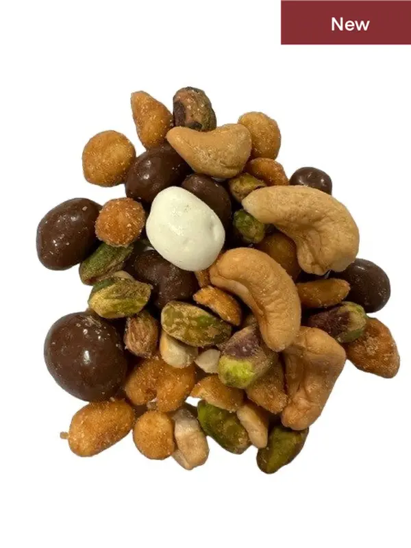This mix is that perfect combination of salt, sweet, and chocolate. Roasted Salted Cashews, Roasted Salted Shelled Pistachios, Honey Roasted Peanuts, Milk Chocolate Peanuts, Triple Treat Chocolate Cranberries (milk, dark, and yogurt).
