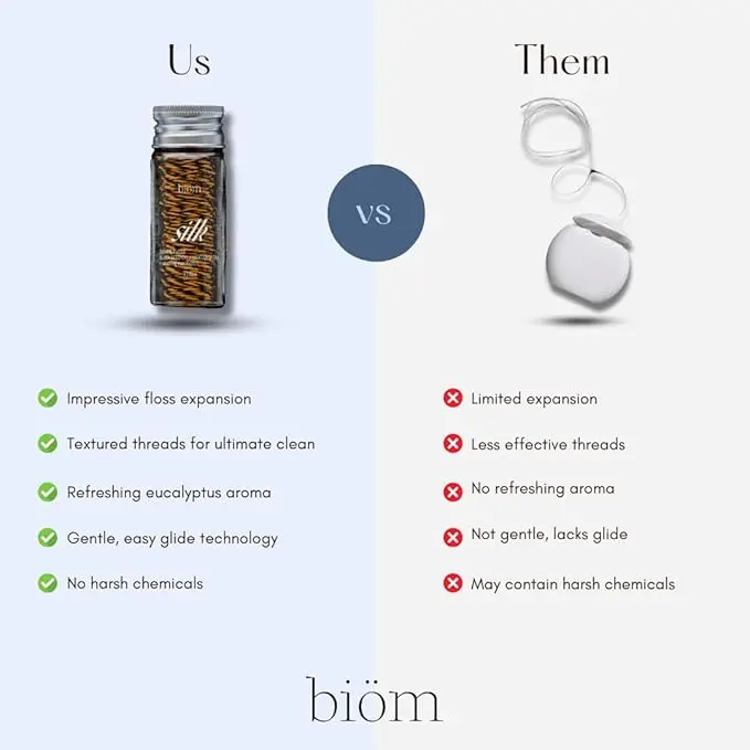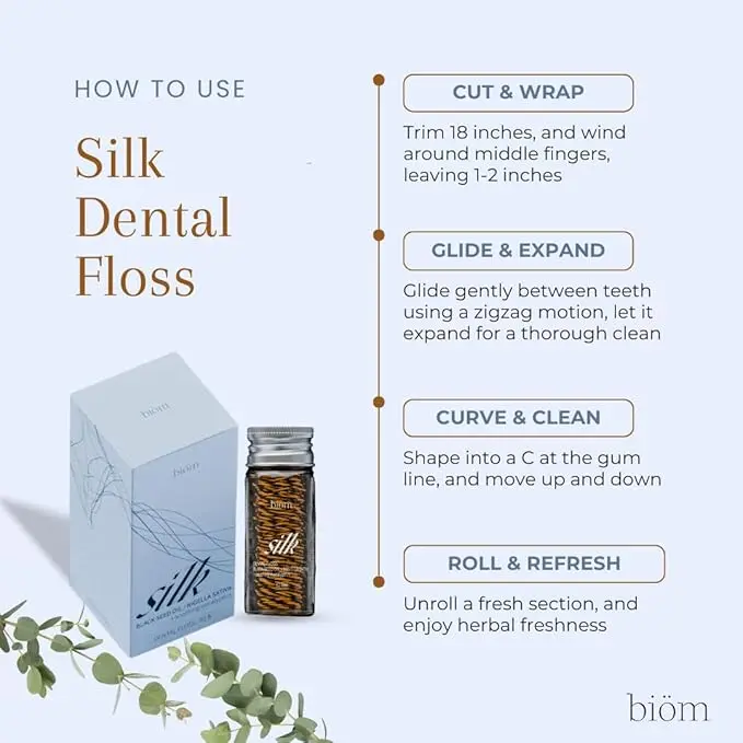 Silk Expanding Floss: High-performance floss that expands to clean between teeth, infused with eucalyptus and nigella sativa to help fight bacteria and support gum health. Packaged in a reusable glass jar.