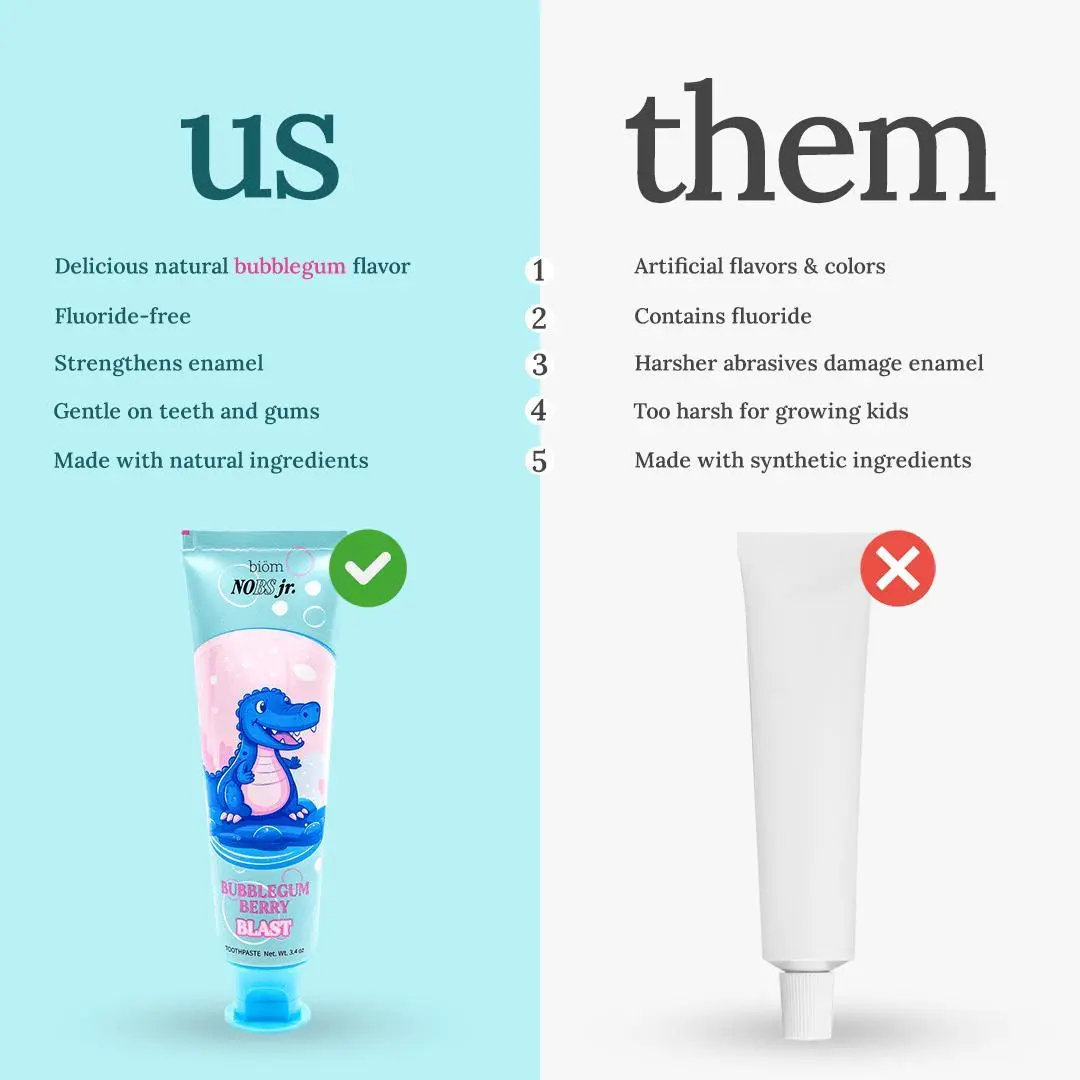NOBS Jr Toothpaste: A gentle, berry-flavored toothpaste for kids, made with 5% nano-hydroxyapatite, xylitol, and safe, nature-inspired ingredients. Designed to build strong brushing habits from the first tooth.