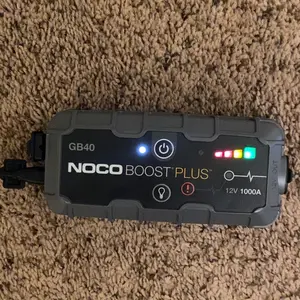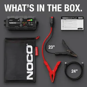 In The Box - GB40 UltraSafe lithium jump starter, heavy-duty booster clamps, 12-volt car charger, USB charging cable, microfiber storage bag, 1-year warranty, and designed in the USA.