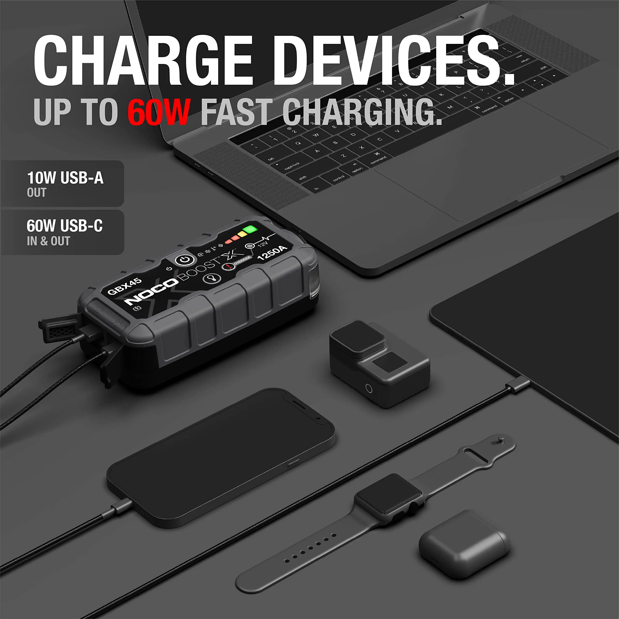 Turbo Chargeable - Boost X is equipped with USB-C technology that, combined with power delivery, gives you lightning-fast recharges. Completely recharges in just 48-minutes, or go from 0% to jump starting in just 5-minutes of charge.