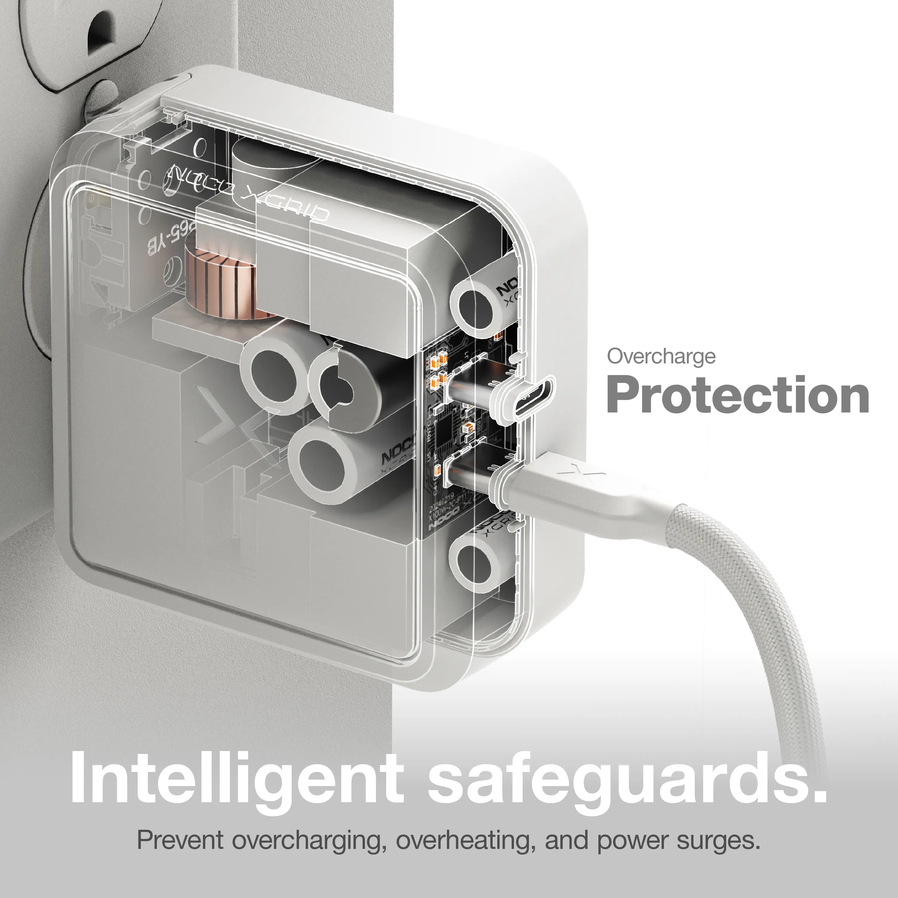 The NOCO XGrid X100 is a compact, dual-port 100W USB-C wall charger utilizing Gallium Nitride (GaN) technology for fast and efficient charging of a wide range of devices. It features a foldable plug design, making it ideal for travel.