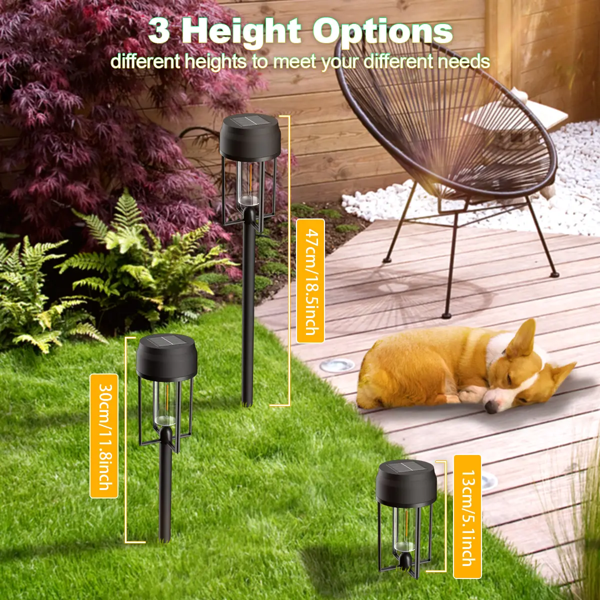 ·【Simple and Unique Design】While ensuring the quality, we have designed a unique yet minimalist shape for the solar garden light, adding a bit of stylish and elegant atmosphere to your outdoor scene. It also has three adjustable heights: 18.5inch, 11.8inch, 5.1inch, whether it's a pathway light to illuminate the front or an underground light to light up the landscape, it can bring you the most appropriate and warm illumination in the scene you want.