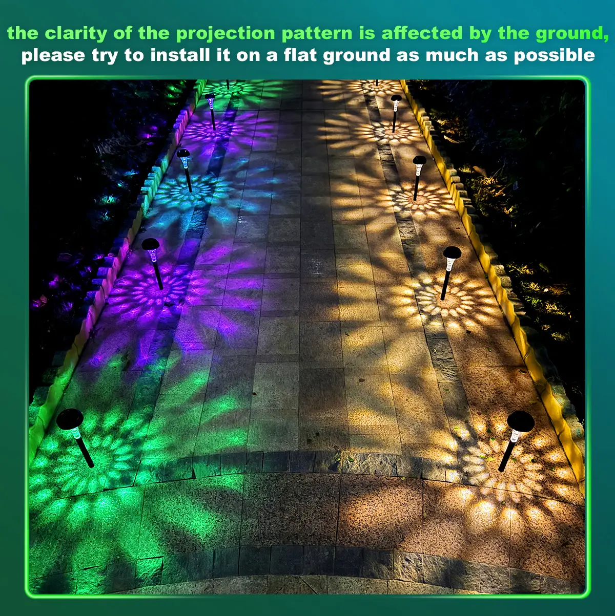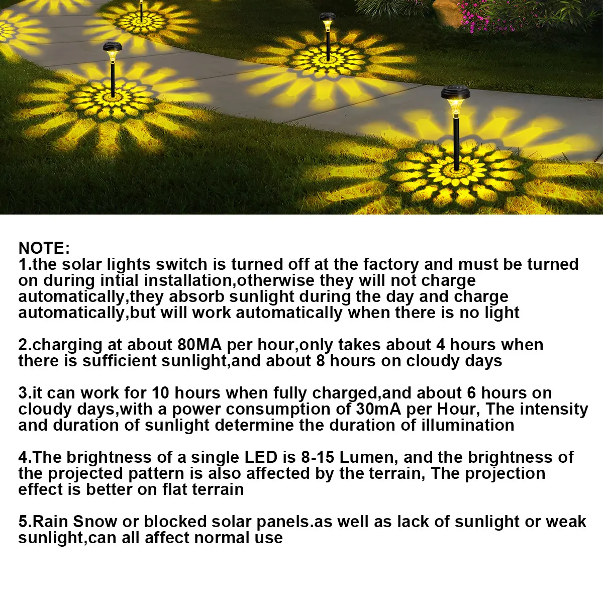 ·Real Sunflower Pattern : Nofibuk's bright solar garden lights casts a colorful sunflower pattern on the ground to make tired courtyard coruscate vitality and perfect improve the value of your house,our walkway solar lights adds a beautiful scenery for your garden.