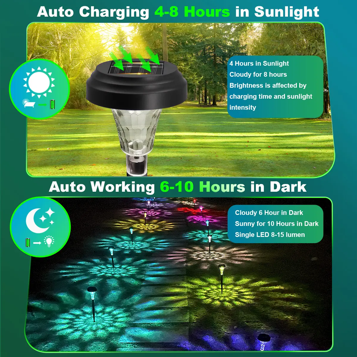 ·[Auto Work] Solar pathway lights absorb solar energy during the day and automatically turn on at dusk.