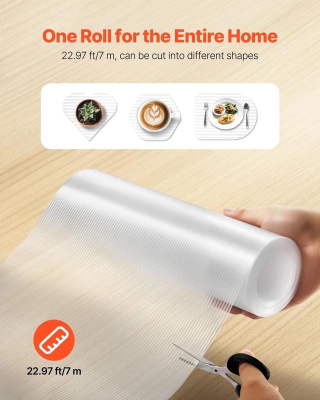 VEVOR Drawer and Shelf Liner is perfect for kitchen cabinets, refrigerators, and bathrooms. This non-adhesive, non-slip liner offers a thick, waterproof solution for shelves and drawers. It's clear, ensuring your surfaces stay visible while protecting them. The liner measures 23 feet, providing ample coverage for various storage needs. Ideal for EVA fridge lining, it keeps your space organized and clean.