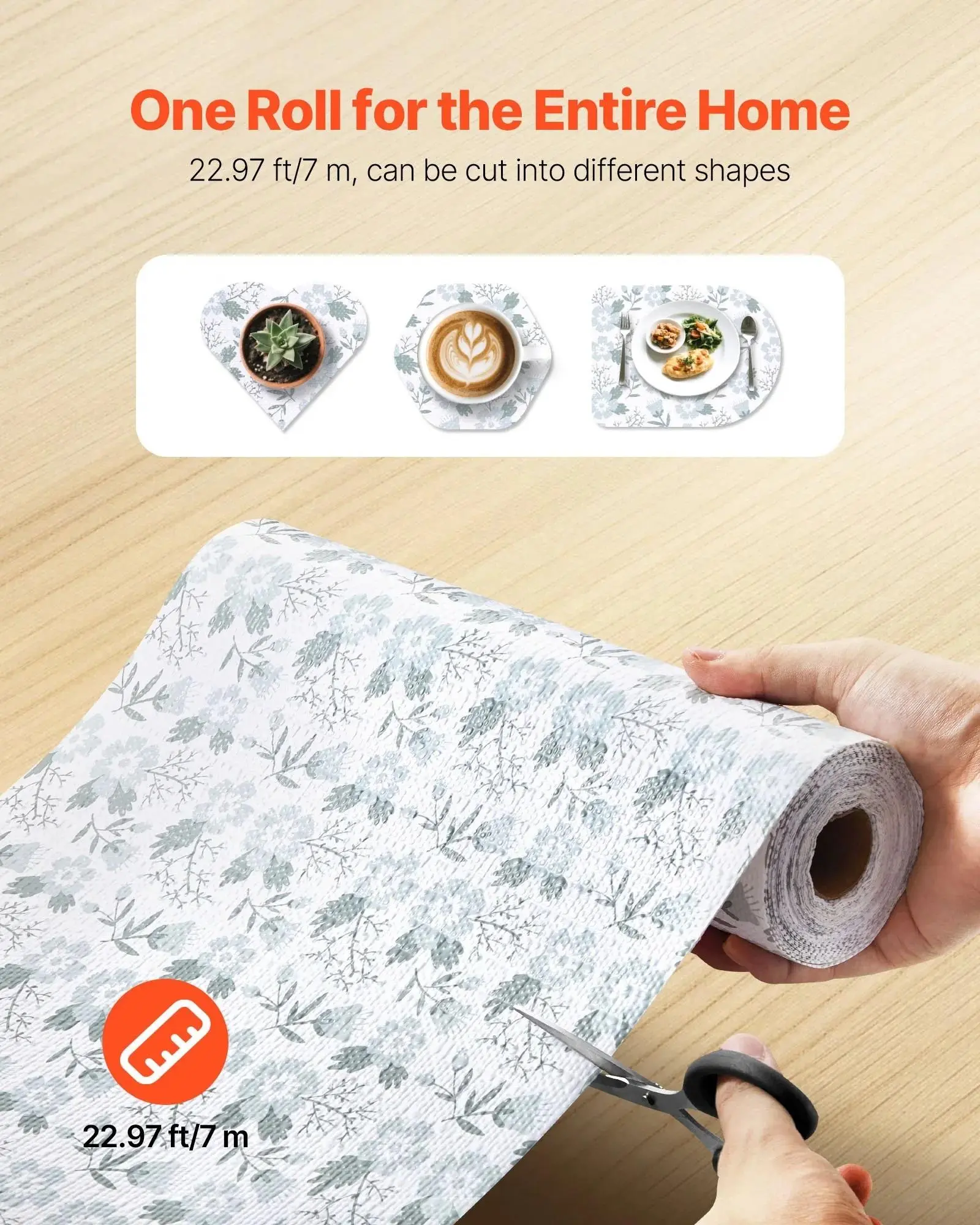 VEVOR Drawer and Shelf Liner is perfect for kitchen cabinets, refrigerators, and bathrooms. This non-adhesive, non-slip liner offers a waterproof solution for shelves. It's made from PVC material, ensuring durability and ease of use. The floral design adds a touch of elegance to any space. This liner measures 23 feet, providing ample coverage for various storage needs.