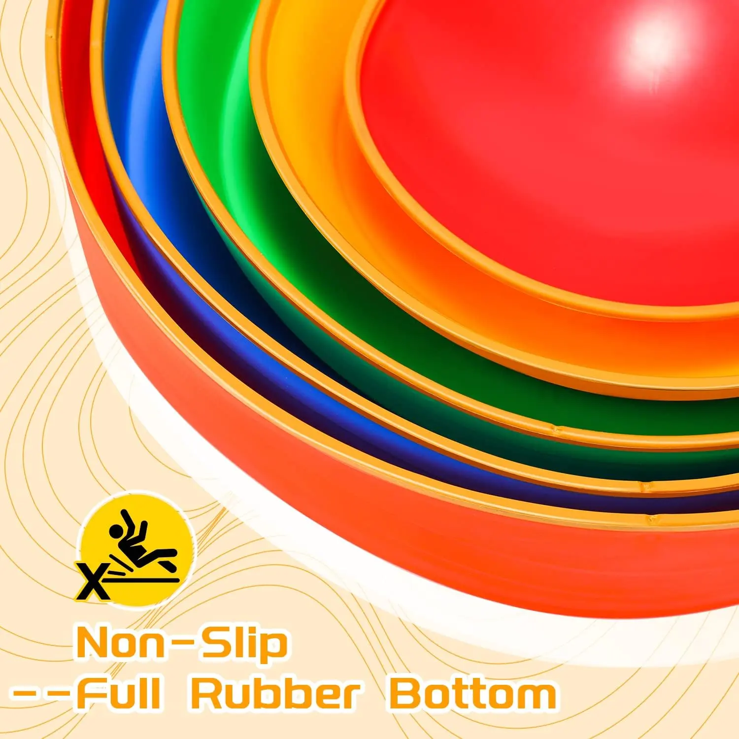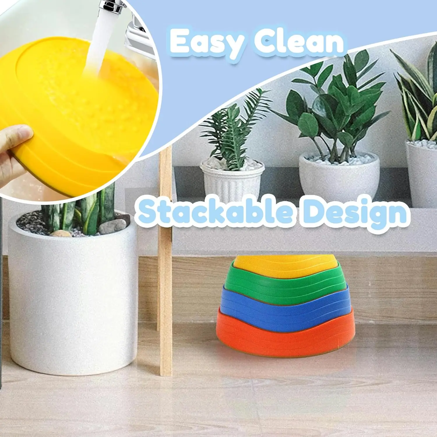 Each stepping stone has a full rubber base to prevent slipping. They nest together for easy cleaning and storage. Suitable for various surfaces like indoor floors, outdoor lawns, and carpets. Stackable and lightweight, kids can clean up independently, saving space and freeing parents.