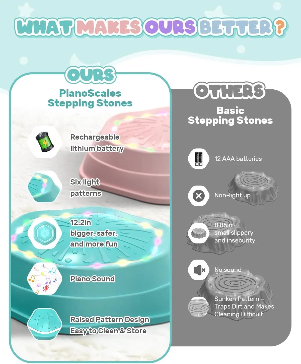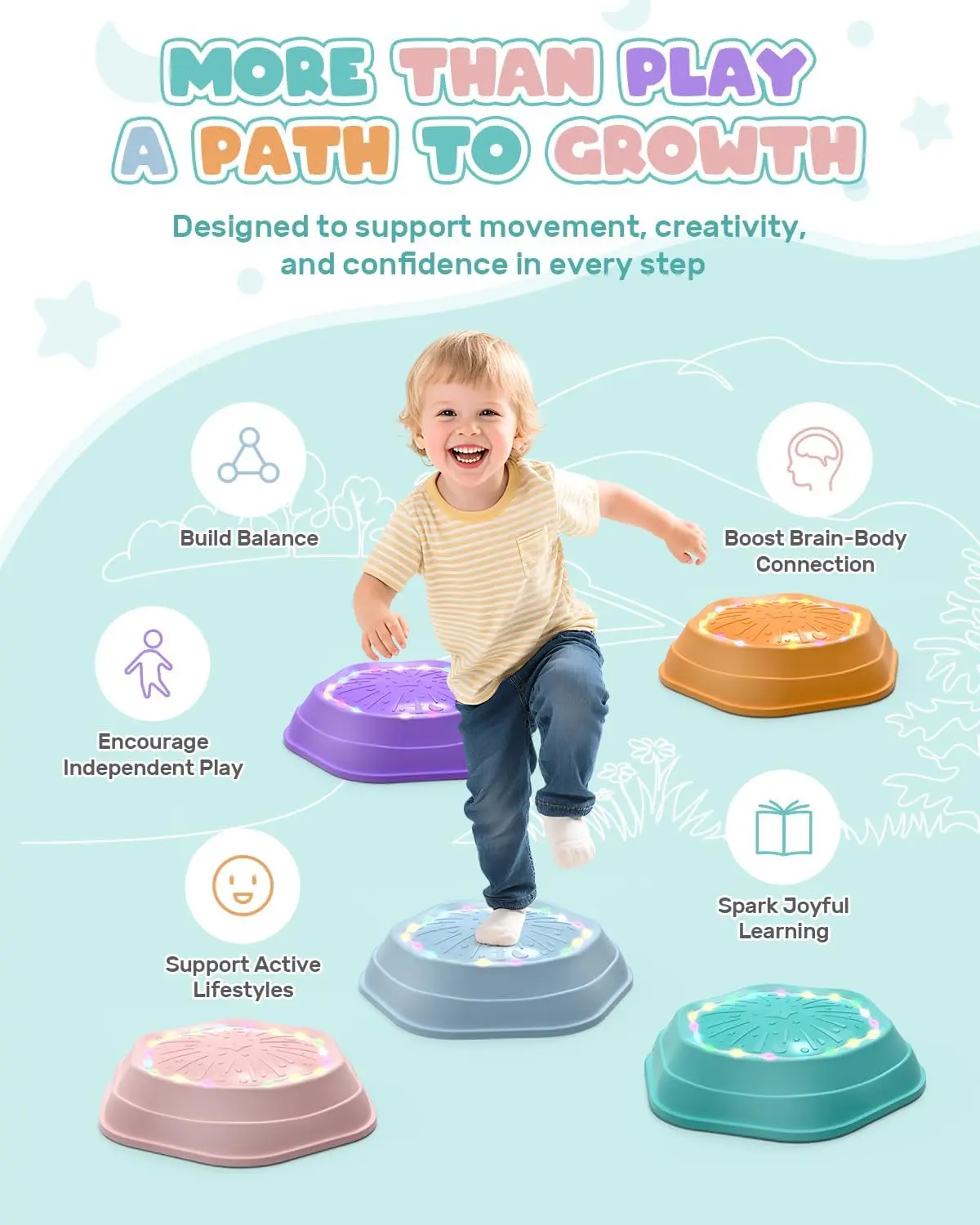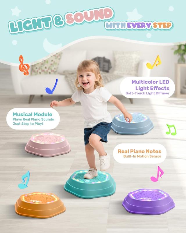 ·These light-up stepping stones emit beautiful tones and colorful lights when stepped on, stimulating creativity and increasing the fun of exercising balance.