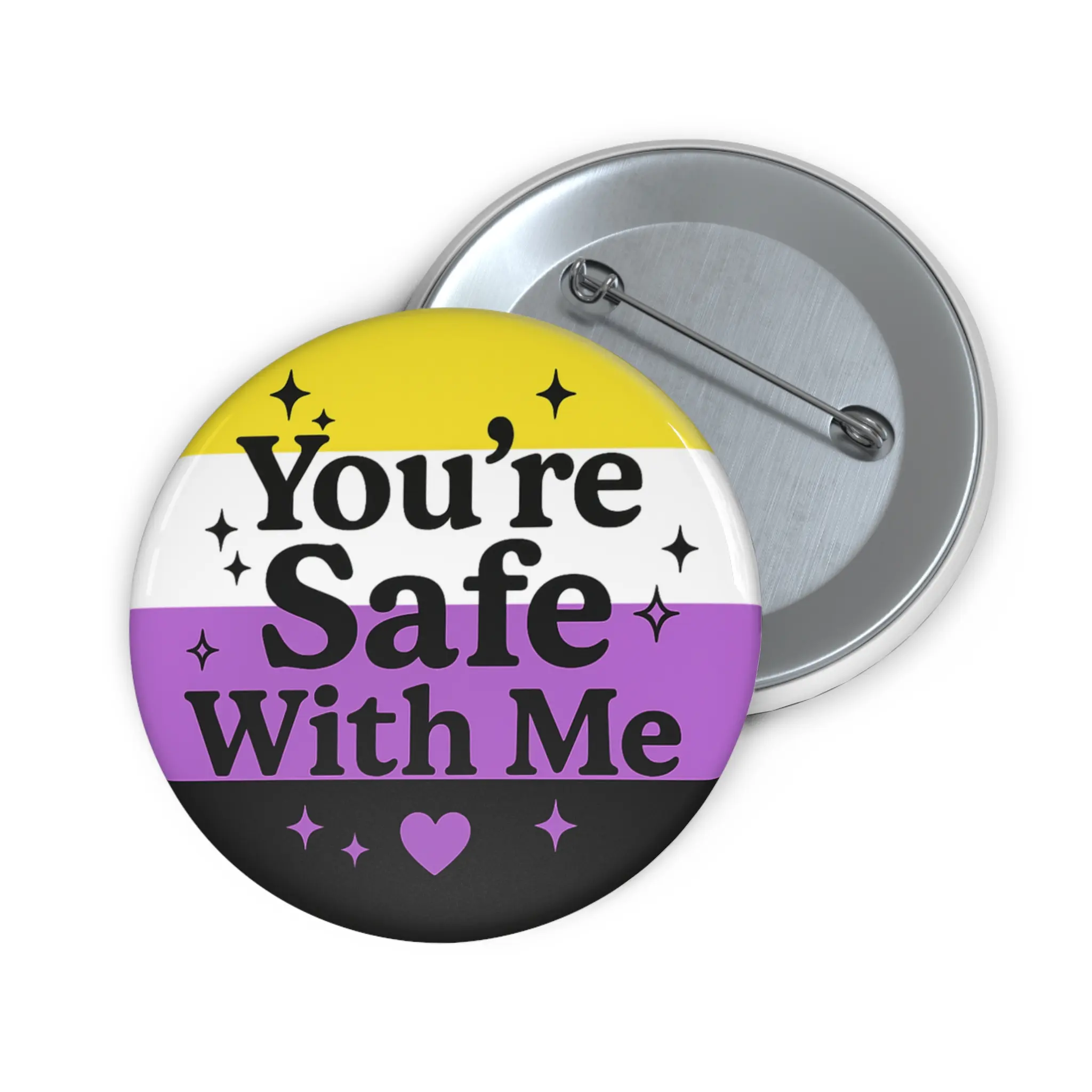 Offer support, signal safety, and celebrate identity with this vibrant nonbinary pride button. Whether you're nonbinary or an affirming ally, this pin shares a clear and gentle message: You're Safe With Me.