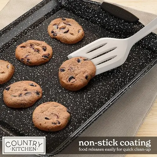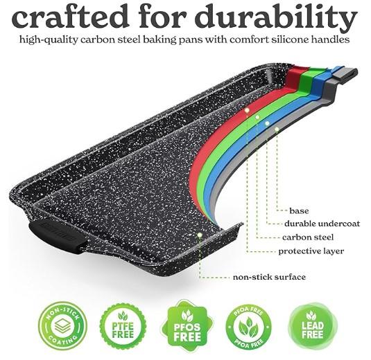 ·Silicone Handles: Our bakeware sets non toxic are designed with safety in mind. The silicone handles ensure a secure grip, allowing you to easily and safely move your nonstick baking sheets in and out of the oven.