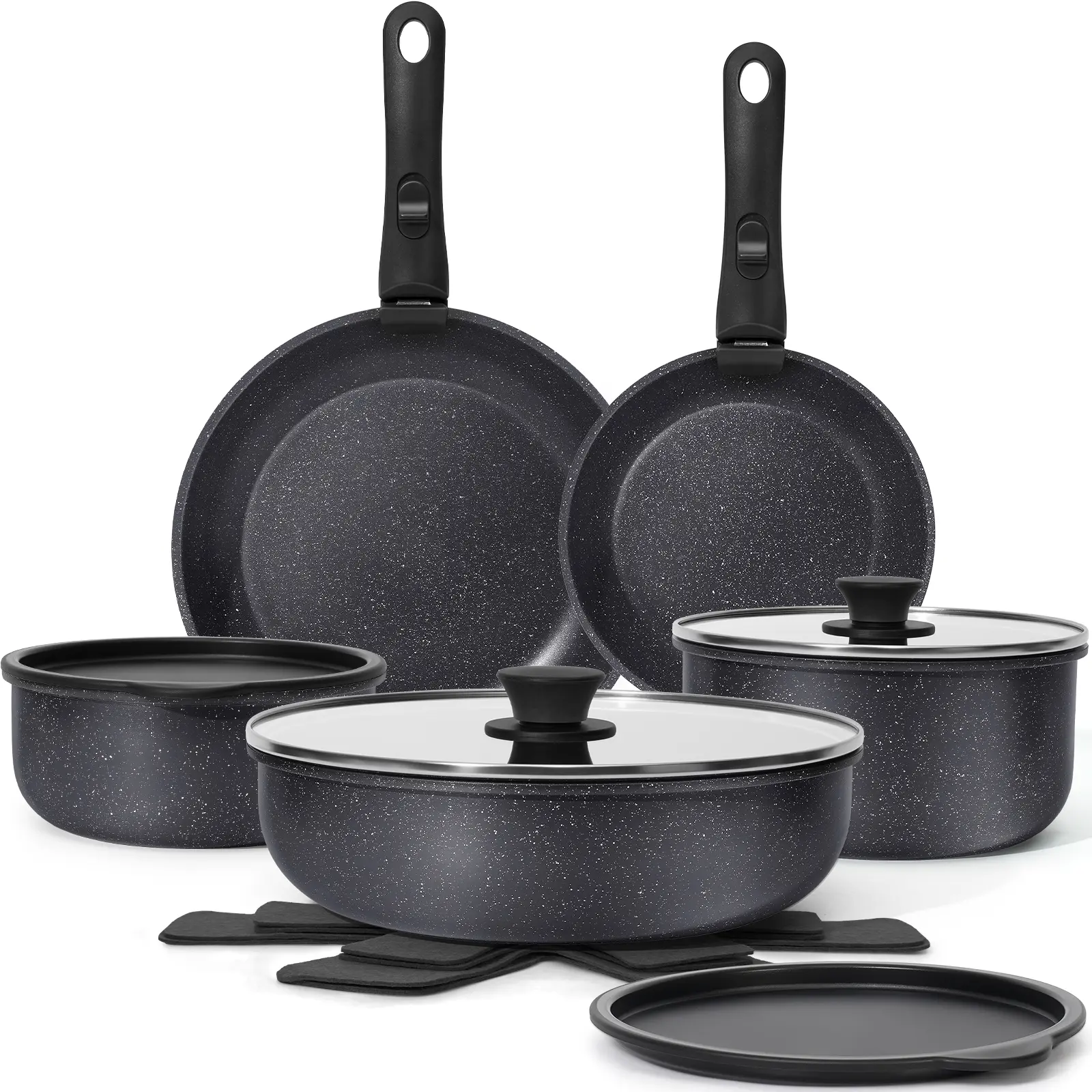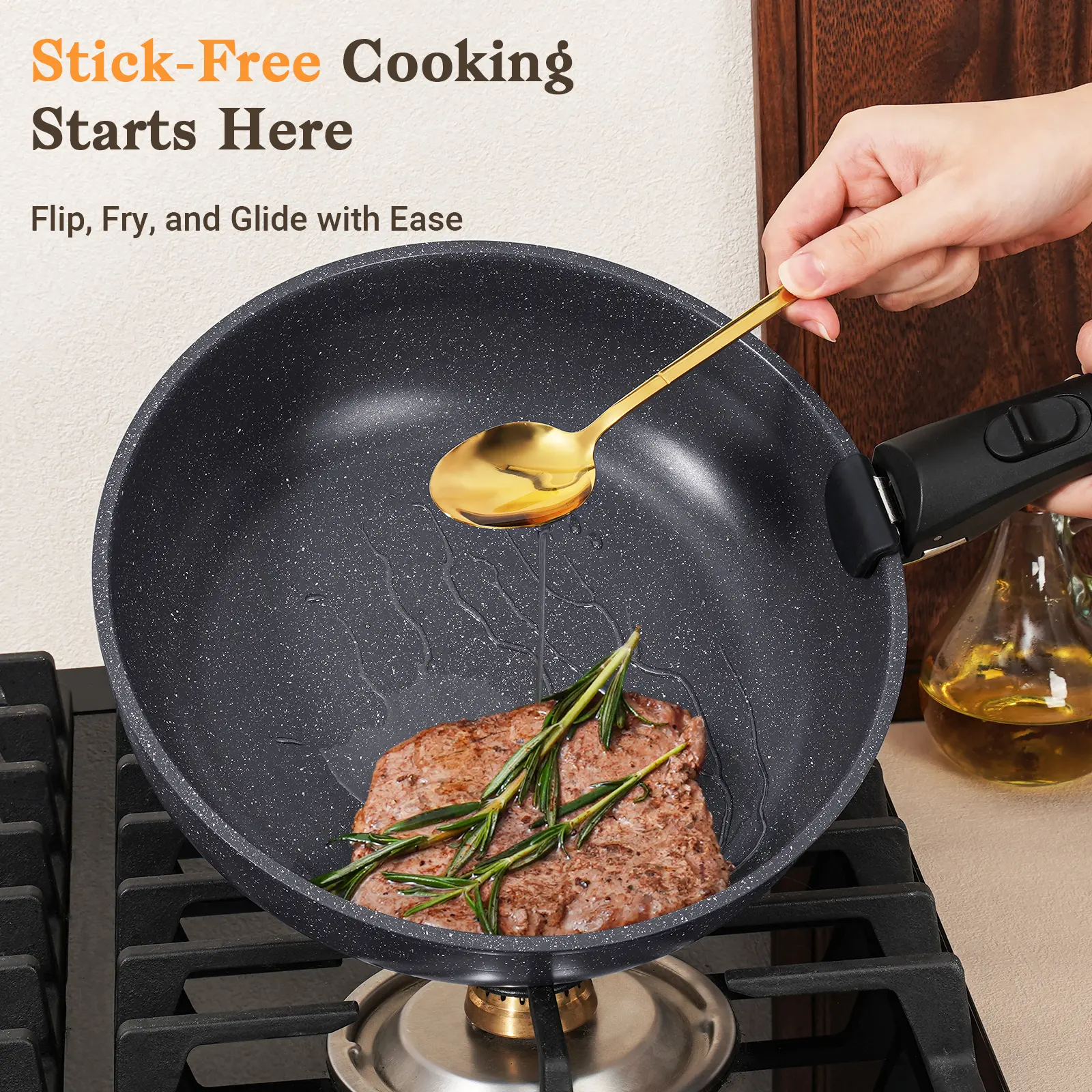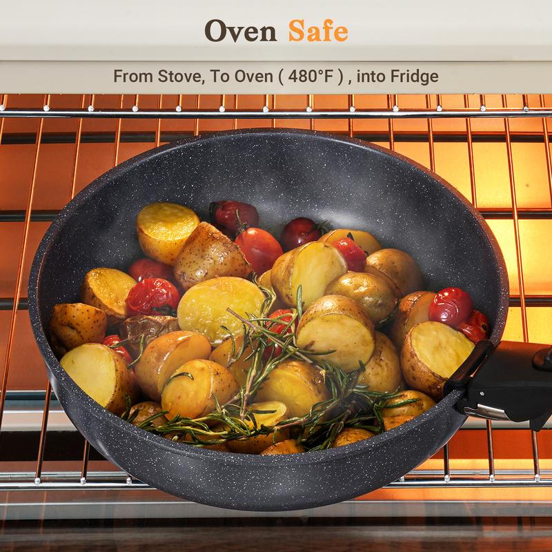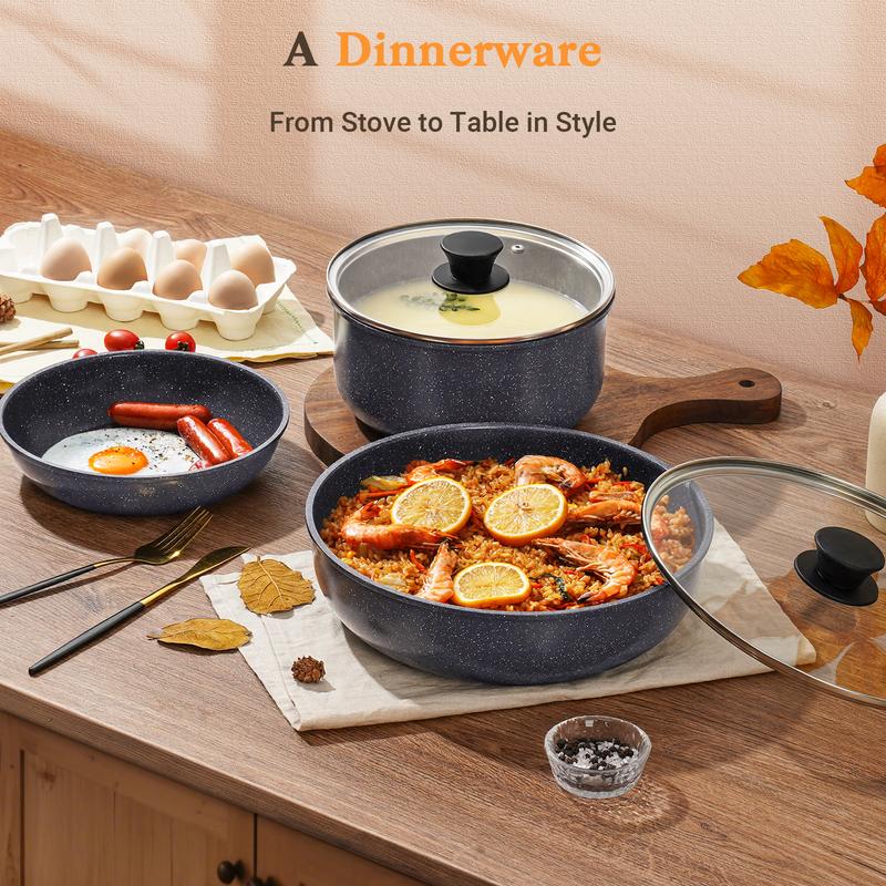 ·Healthy Granite Cookware Sets - SGS approved. Non-toxic, free of PFAS, PFOA, PFOS, lead, cadmium and other toxic substances that can leach into food, ensures effortless food release and healthier meals.