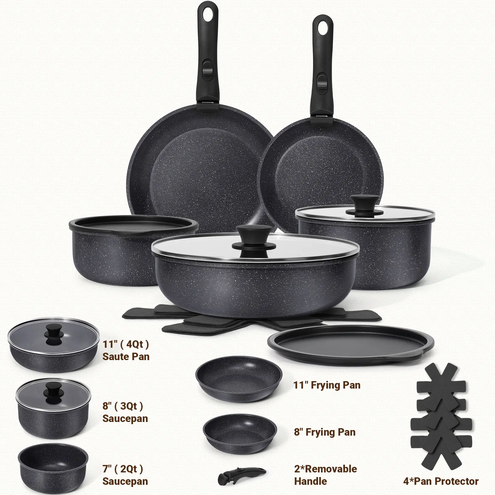 ·Complete Set: SODAY 15 pieces cookware set includes 1pcs 11" Saute Pan,1pcs 8&10.6"Frying Pans, 1pcs 2QT Sauce Pan & 3QT Sauce Pan, 2* Removable Handle, 8.7&11"Glass Lid, 4*Pot Protectors, 2*Fridge Storage Lid. From sauteing to simmering, our pots and pans set provides versatile cooking options to suit your culinary needs