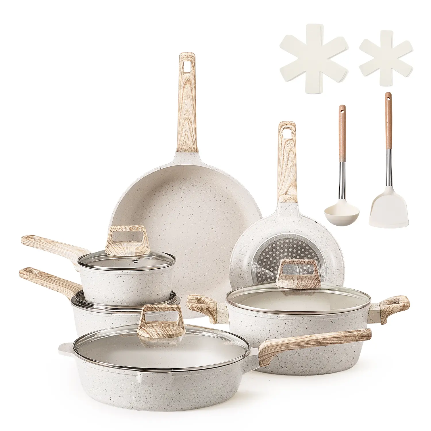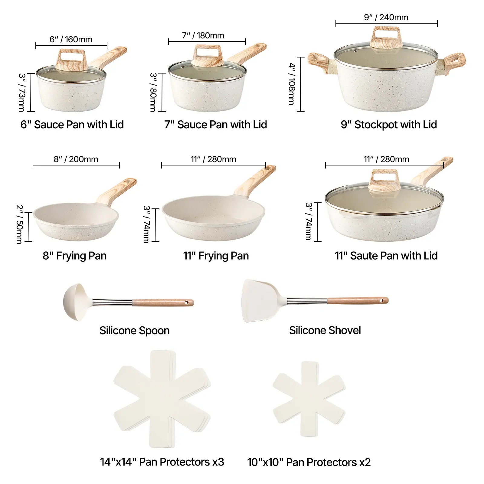 • 17-Piece Cookware Set: A versatile pots and pans set that includes: 6in sauce pan with lid, 7in sauce pan with lid, 8in frying pan, 11in frying pan, 11in saute pan with lid, 9in stockpot with lid, 2 10x10in pan protectors, 3 14x14in pan protectors, silicone spoon, silicone shovel
