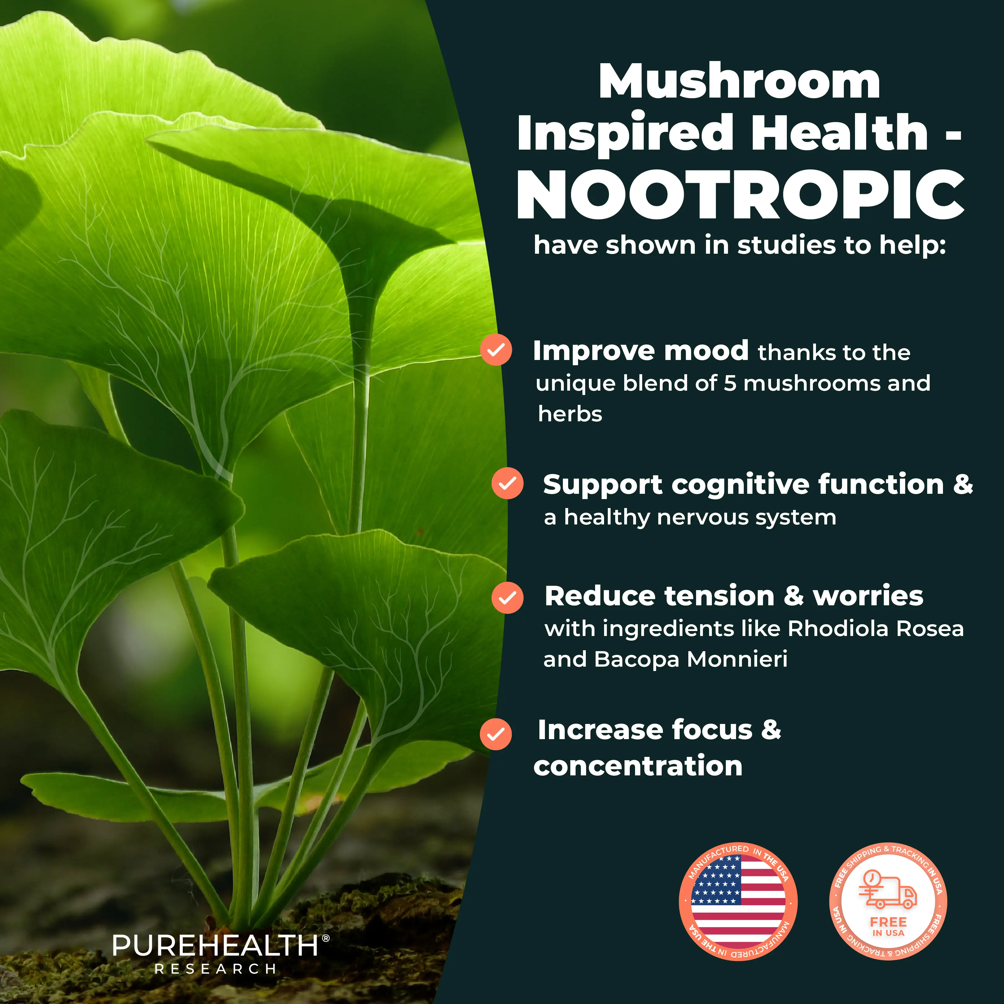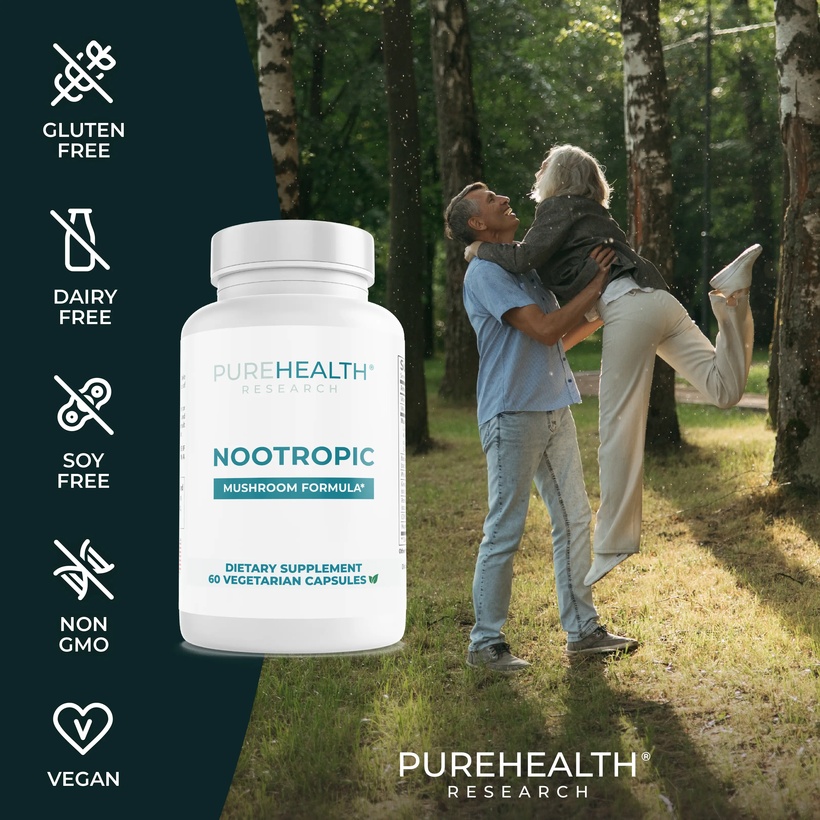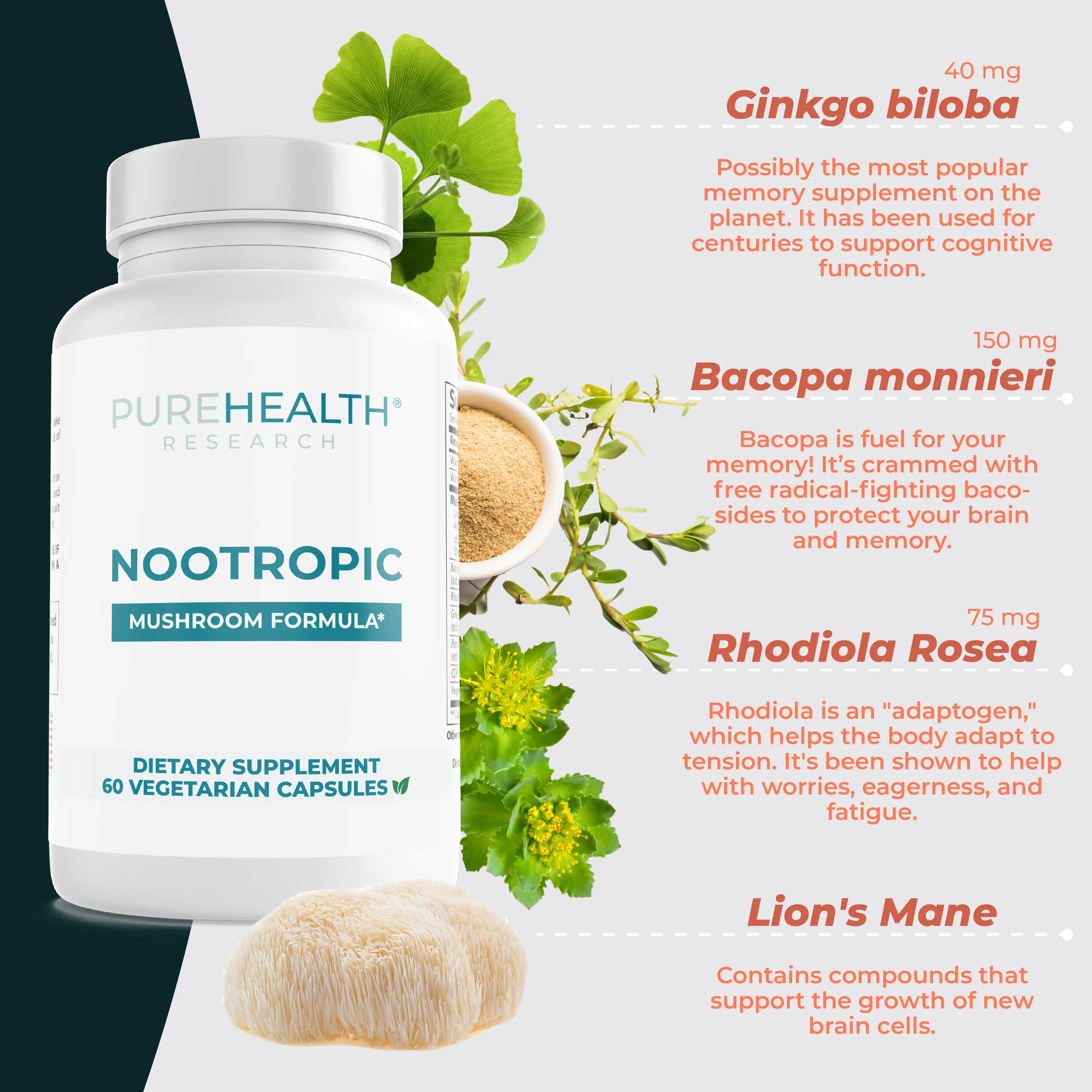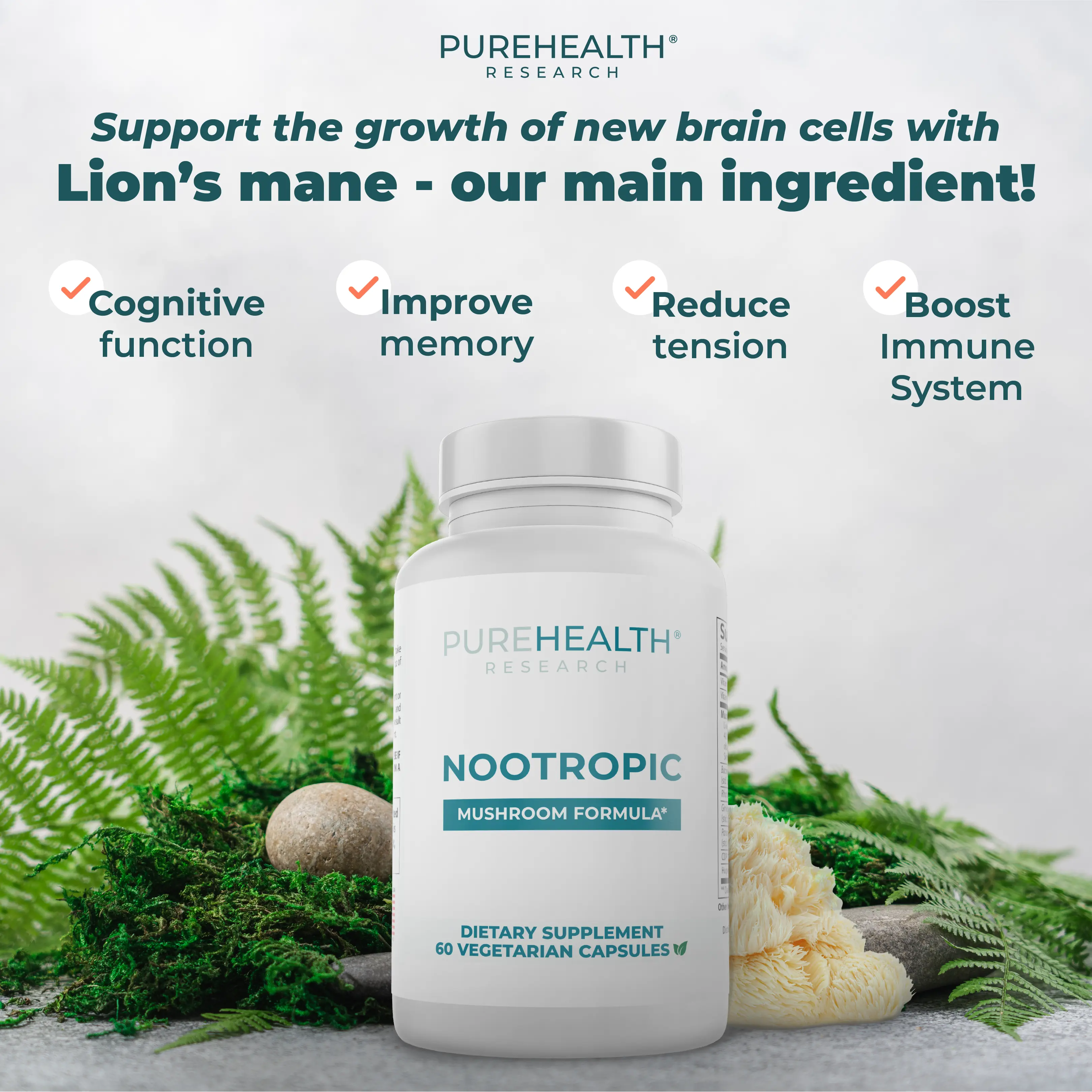 Have you been feeling not yourself lately - lack of concentration, short memory or other cognitive functions disturb your day-to-day life? Our Noontropic Mushroom Formula by PureHealth Research is a 4 Mushroom Complex that includes Lion's Mane, Chaga, Shiitake, and Reishi mushrooms. These support immune health, mood, and focus. Every day can be a new journey without lack of focus or brain-fog.