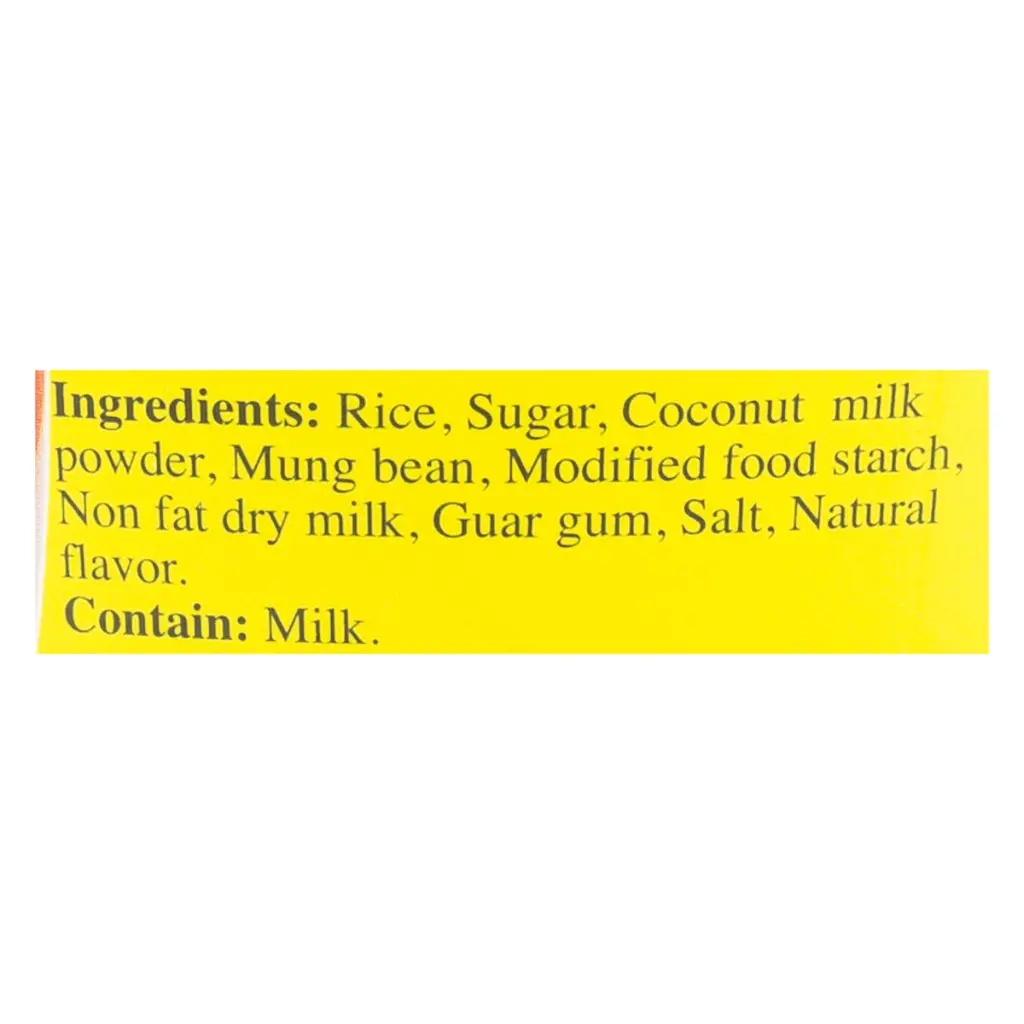 Ingredients: Rice, Sugar, Coconut milk powder, Mung bean, Modified food starch, Non fat dry milk, Guar gum, Salt, Natural Flavor.