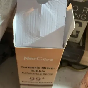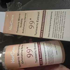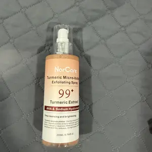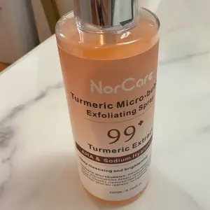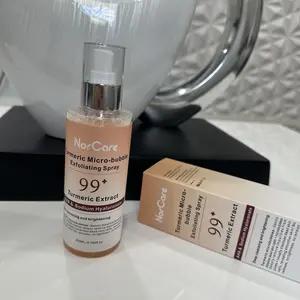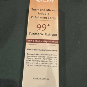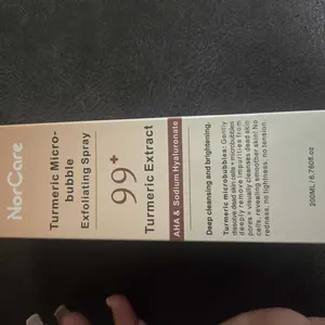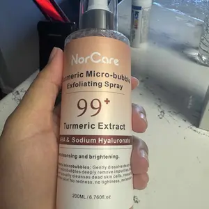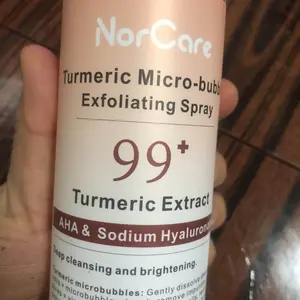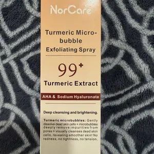 NorCare Turmeric Micro-bubble Exfoliating Spray offers gentle exfoliation thanks to its microbubbles that help remove dead skin cells and impurities. It contains turmeric extract, AHAs, and hyaluronic acid, providing deep cleansing and leaving the skin smoother.
