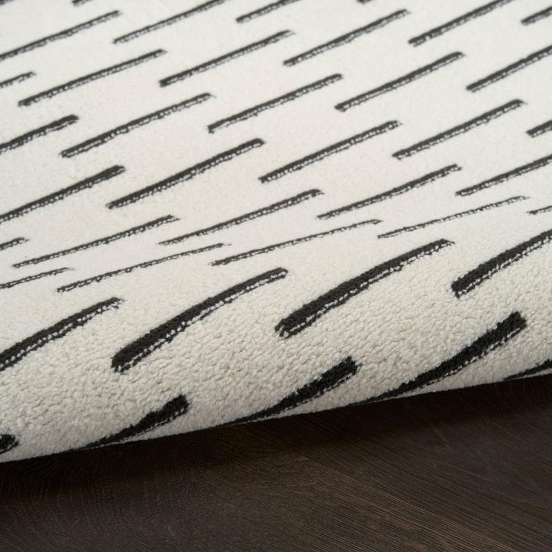 Bring balance to your space with this black and white minimalist rug from the Nordic collection. The dashed pattern invites a clean and sophisticated look, which is enhanced by a subtle high-low pile that adds a touch of dimension. This modern rug is made from polyester and is finished with a silky sheen. Expertly crafted in a low-profile construction that’s easy to clean – perfect for busy households with pets and young kids.