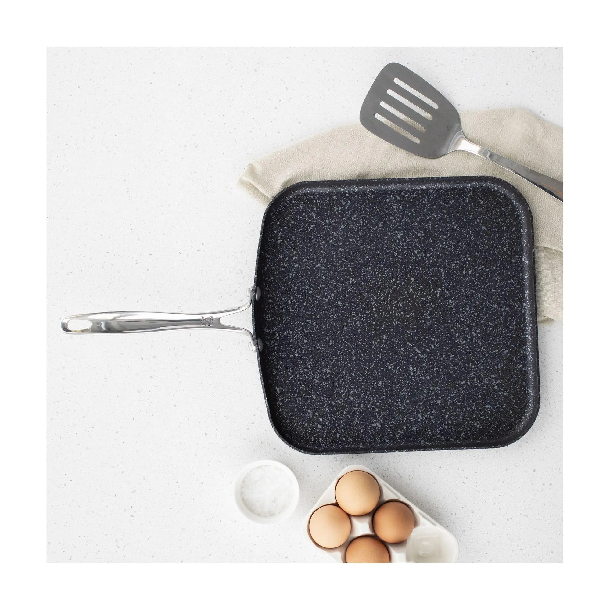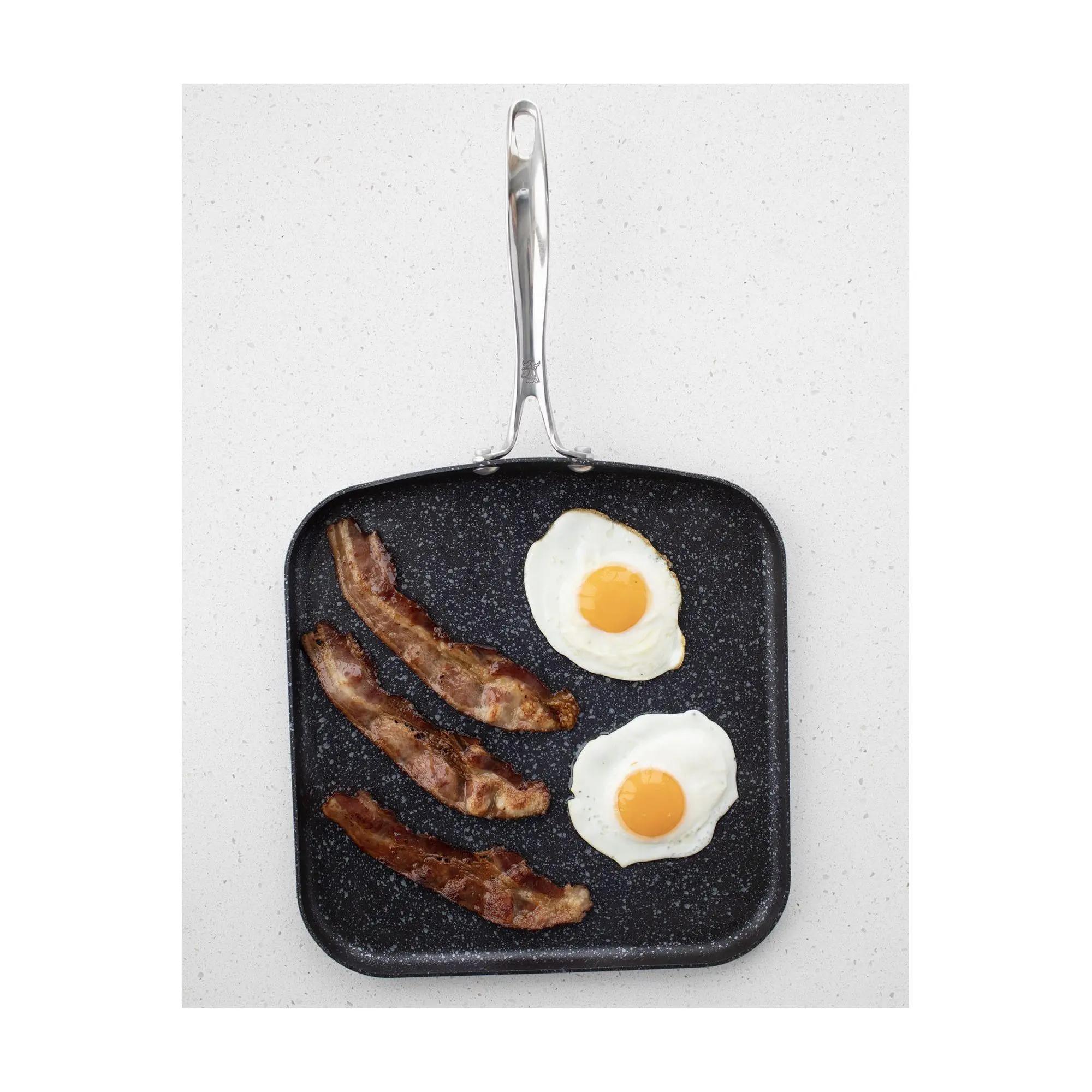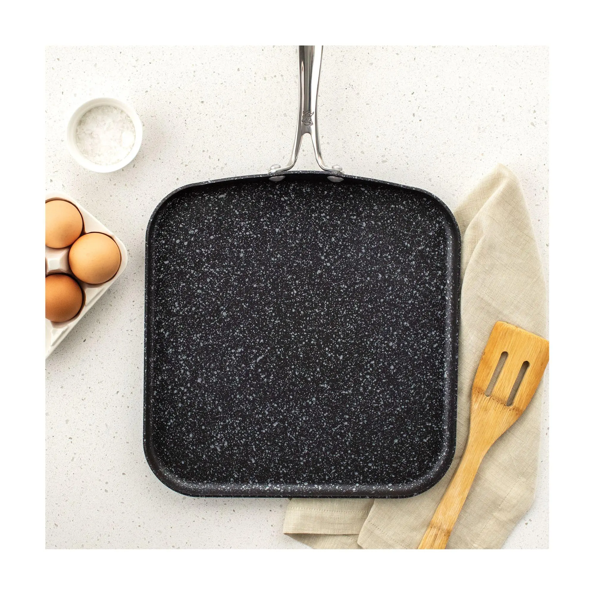 Elevate your breakfast game or master the art of dinner with the Basalt square griddle. Designed for the modern cook, this versatile piece brings together the durability of aluminum and the convenience of a ceramic nonstick surface. Whether you're flipping pancakes, sizzling turkey bacon, or searing veggies, this griddle ensures delicious results. From stovetop to oven, make every meal a delight with this essential kitchen companion. From Nordic Ware.