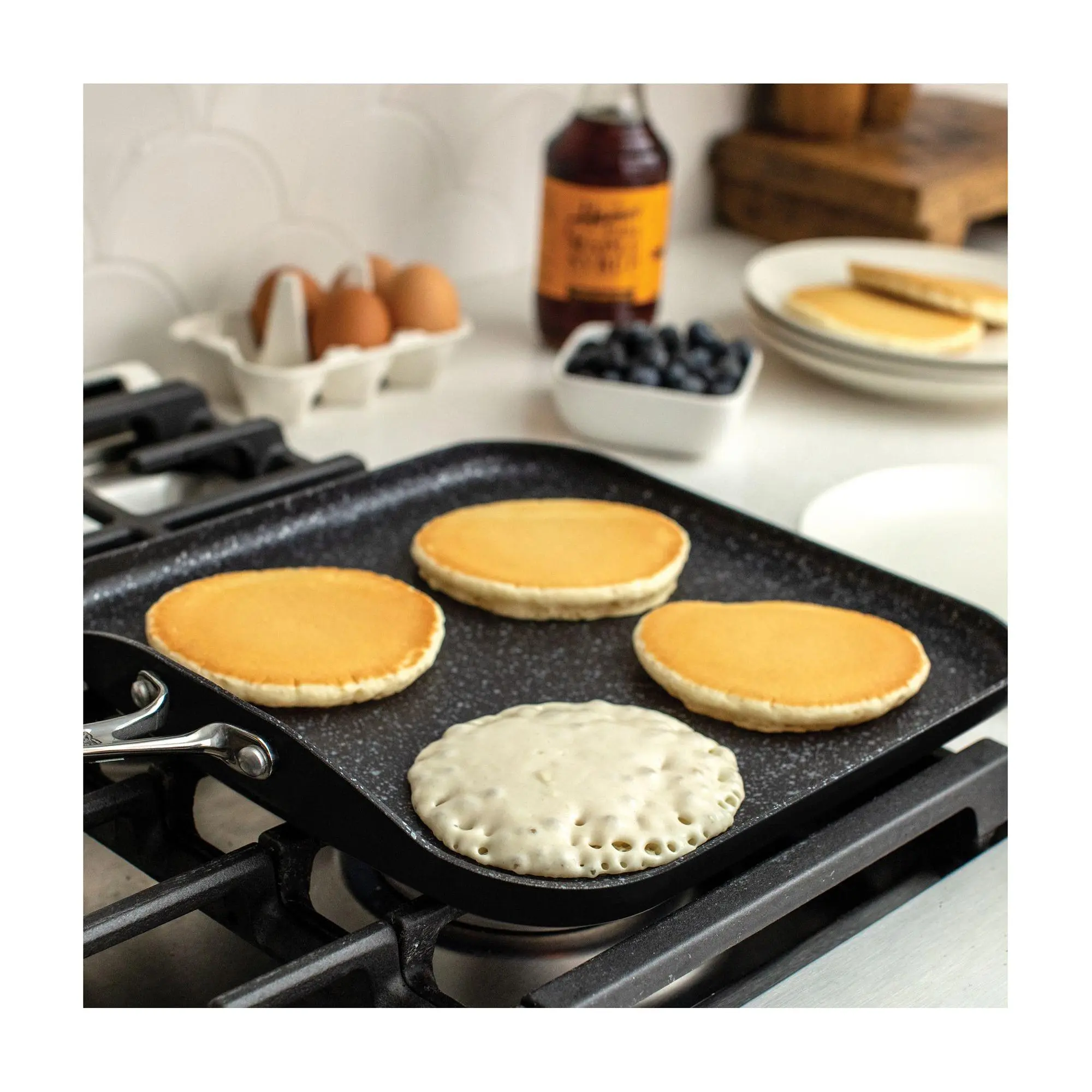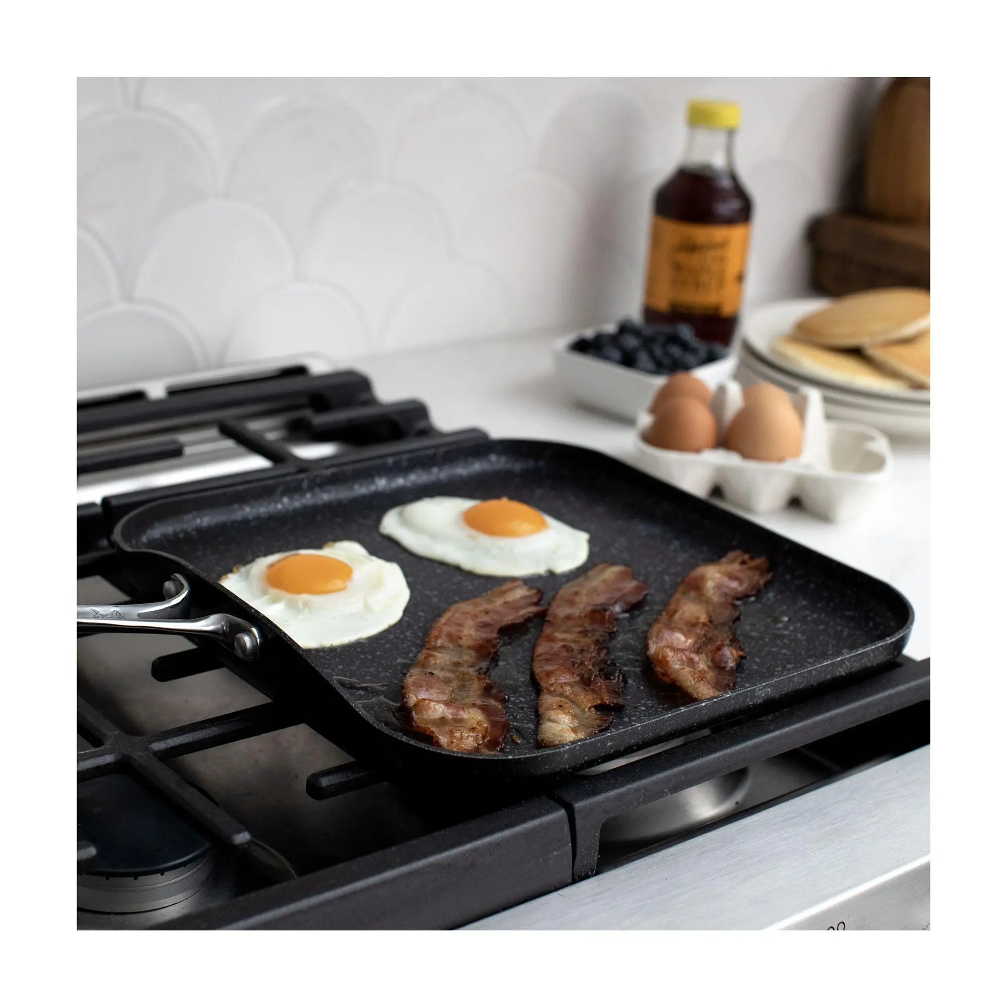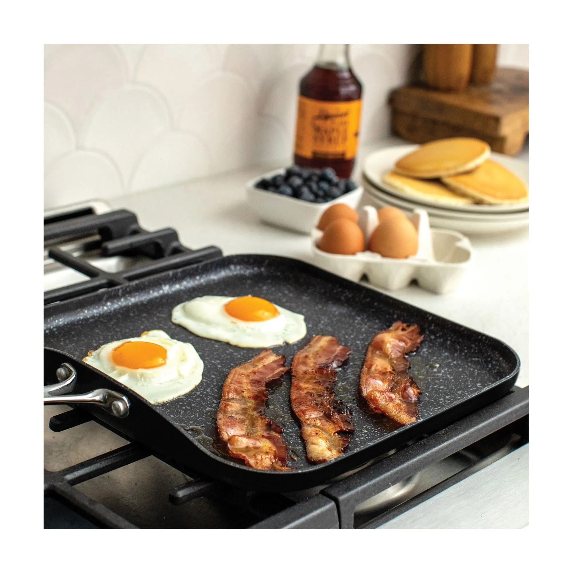 Elevate your breakfast game or master the art of dinner with the Basalt square griddle. Designed for the modern cook, this versatile piece brings together the durability of aluminum and the convenience of a ceramic nonstick surface. Whether you're flipping pancakes, sizzling turkey bacon, or searing veggies, this griddle ensures delicious results. From stovetop to oven, make every meal a delight with this essential kitchen companion. From Nordic Ware.