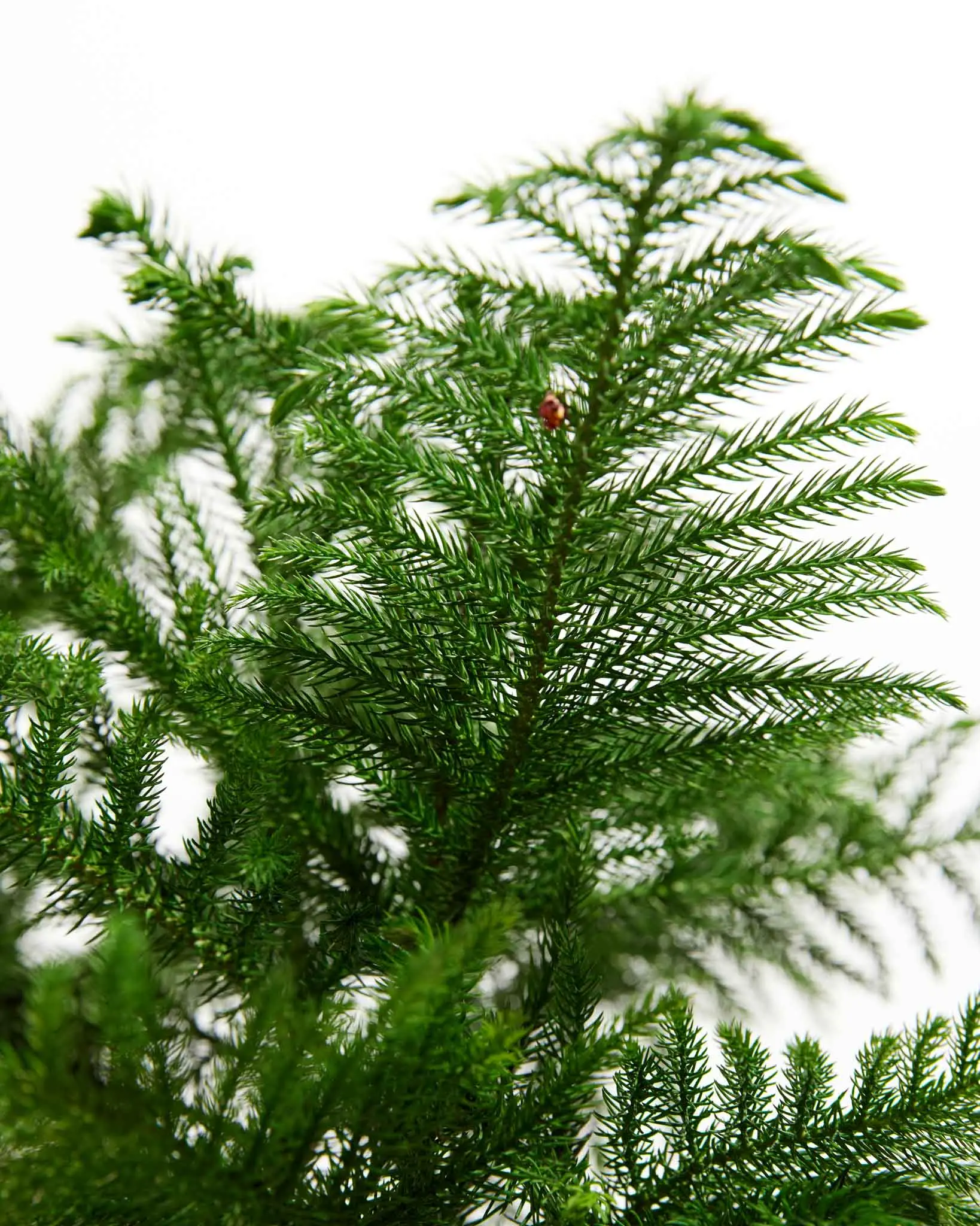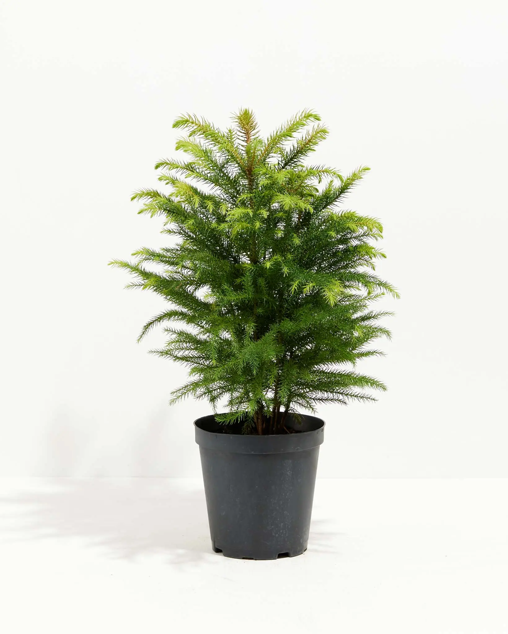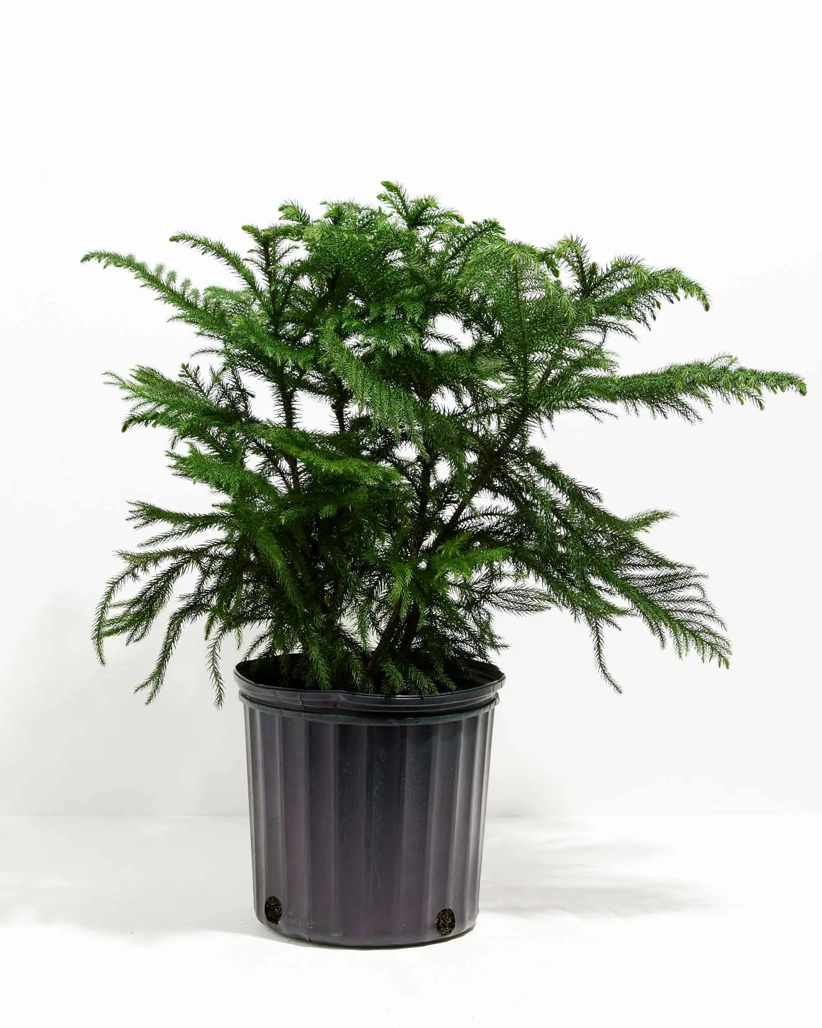 Our Norfolk Pine (Araucaria heterophylla) is a party waiting to happen! He's ready for all manner of decoration and costume. His upright trunk sits erect with his pyramidal shape. His evergreen form holds whorled, parallel branches (typically 5 branches per whorl) in layers. He will do double-duty for the sights of the season as well as a great houseplant throughout the year growing up to 3-5' over time!