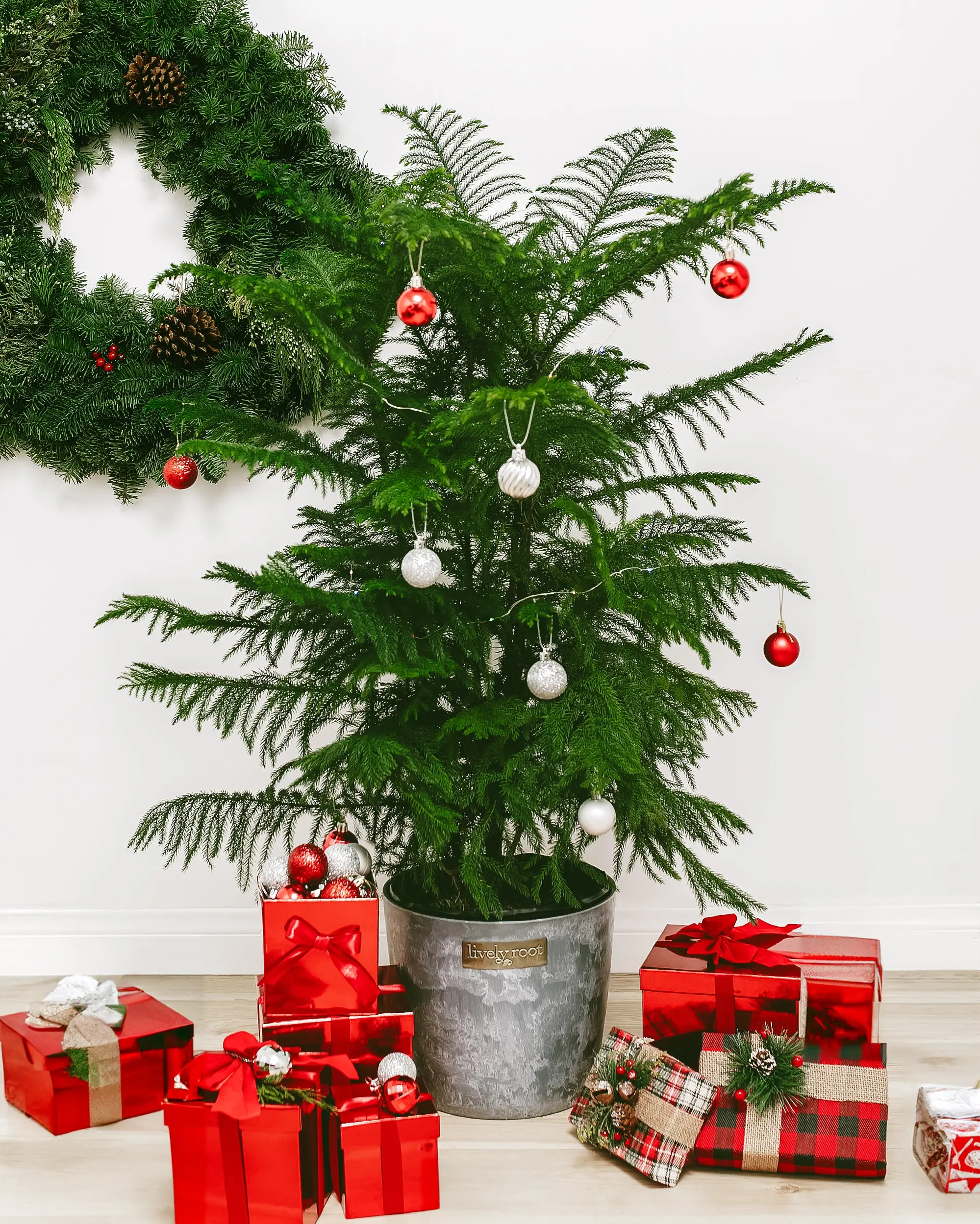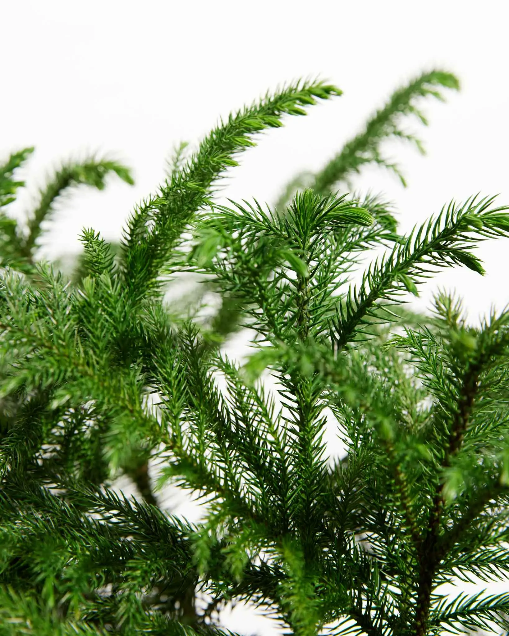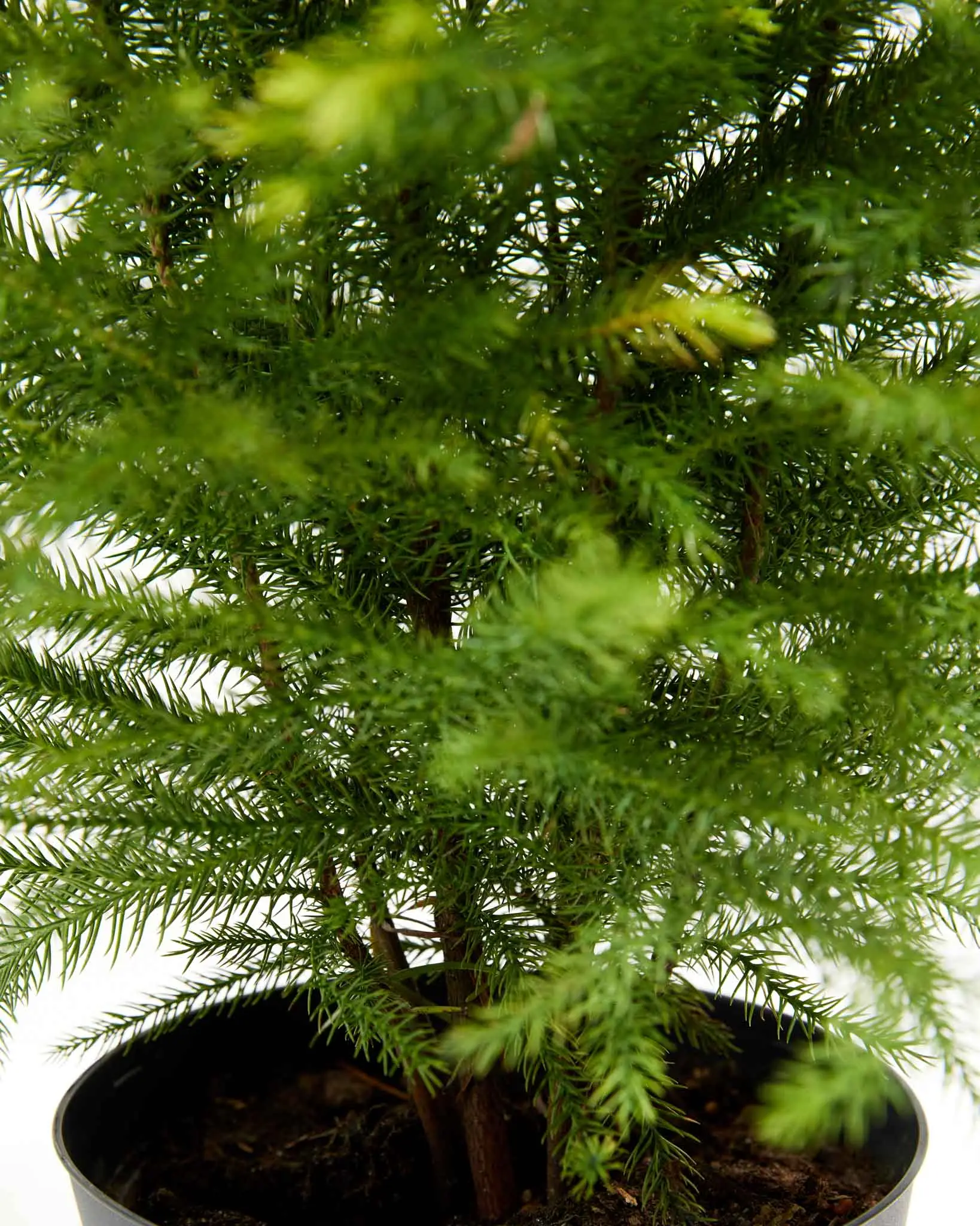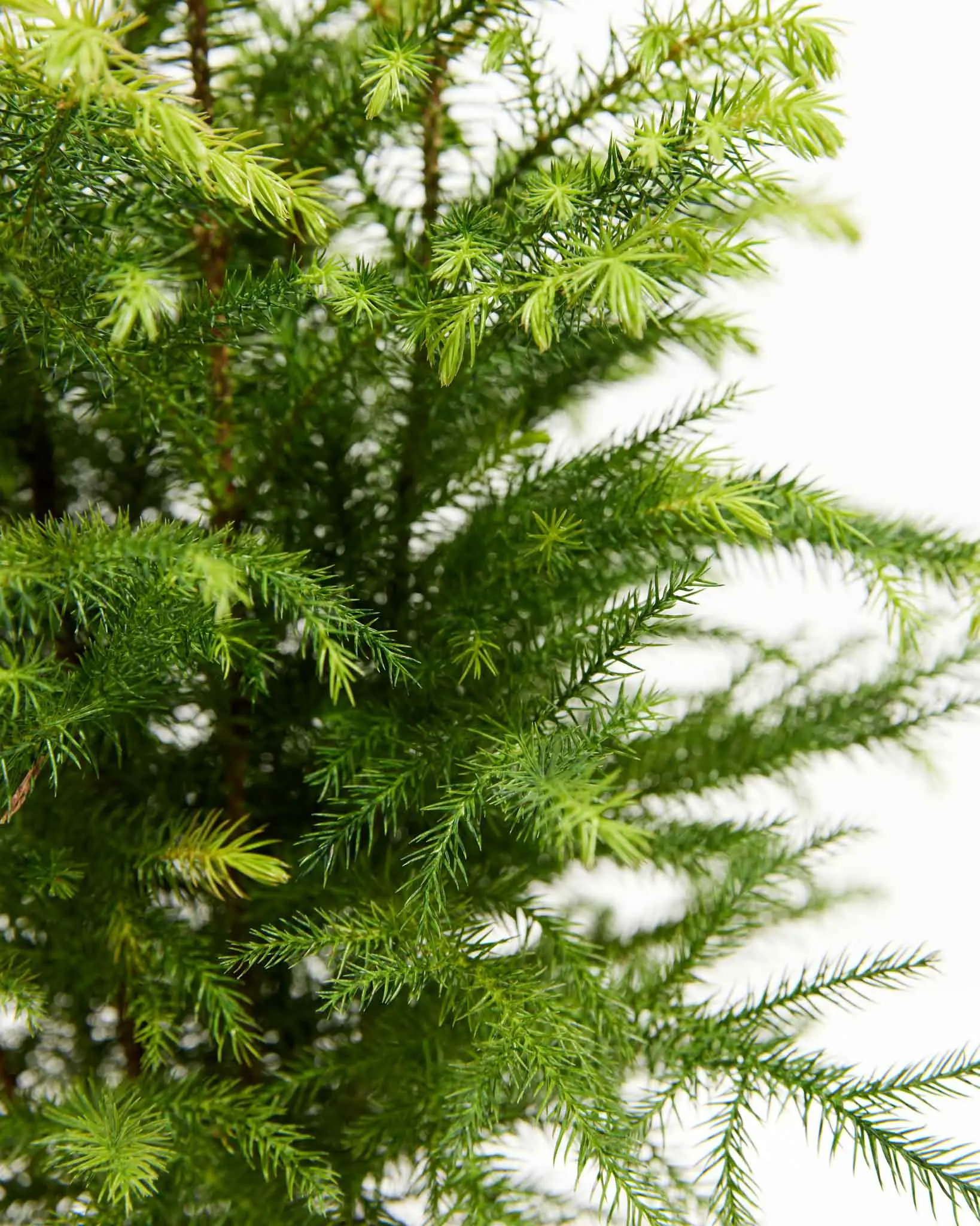 Our Norfolk Pine (Araucaria heterophylla) is a party waiting to happen! He's ready for all manner of decoration and costume. His upright trunk sits erect with his pyramidal shape. His evergreen form holds whorled, parallel branches (typically 5 branches per whorl) in layers. He will do double-duty for the sights of the season as well as a great houseplant throughout the year growing up to 3-5' over time!