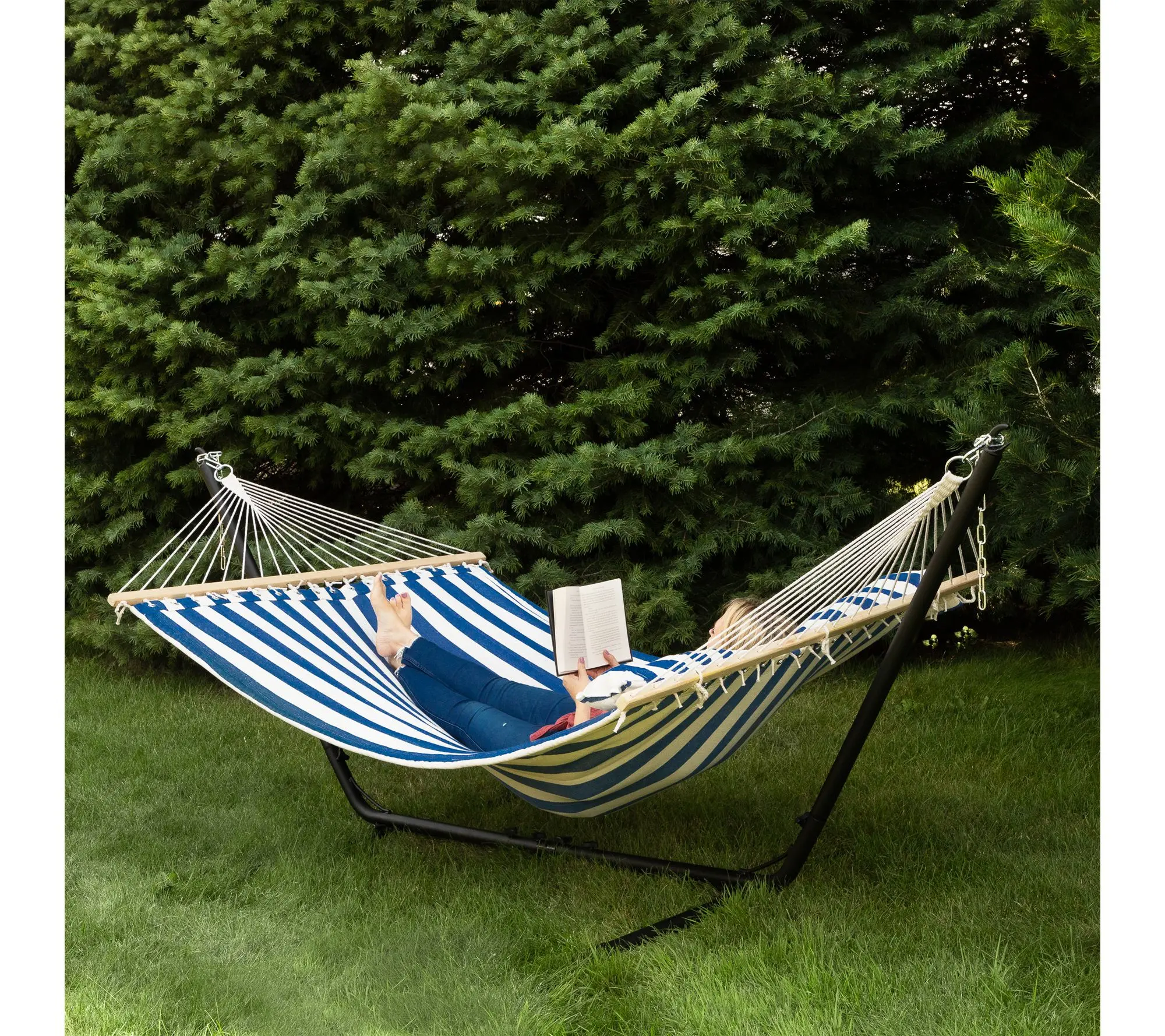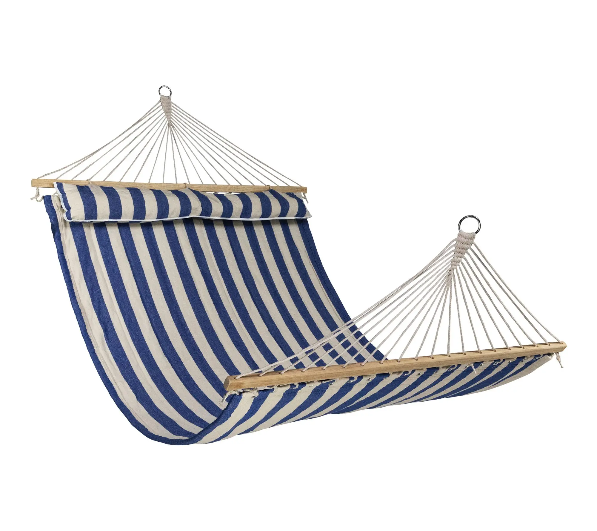 Share summer afternoons with someone special or enjoy quiet evenings stretched out in this double hammock, designed for relaxing beneath the open sky. Wide blue and cream stripes paired with a quilted design and built-in pillow create a comfortable spot to unwind, read, or drift into a peaceful nap. From Northlight.
