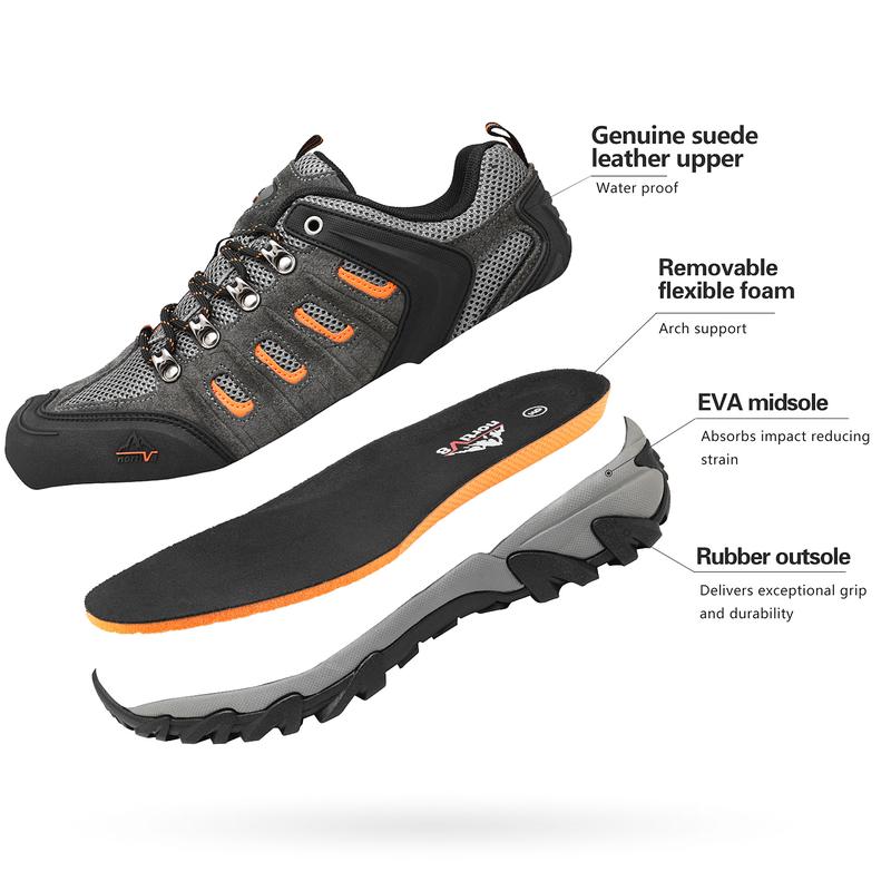 ·Genuine Leather & Protective toe: High-performance suede leather of these men's waterproof low-top hiking shoes is softer and more wear-resistant than PU and a rubber toe cap for anti-collision.