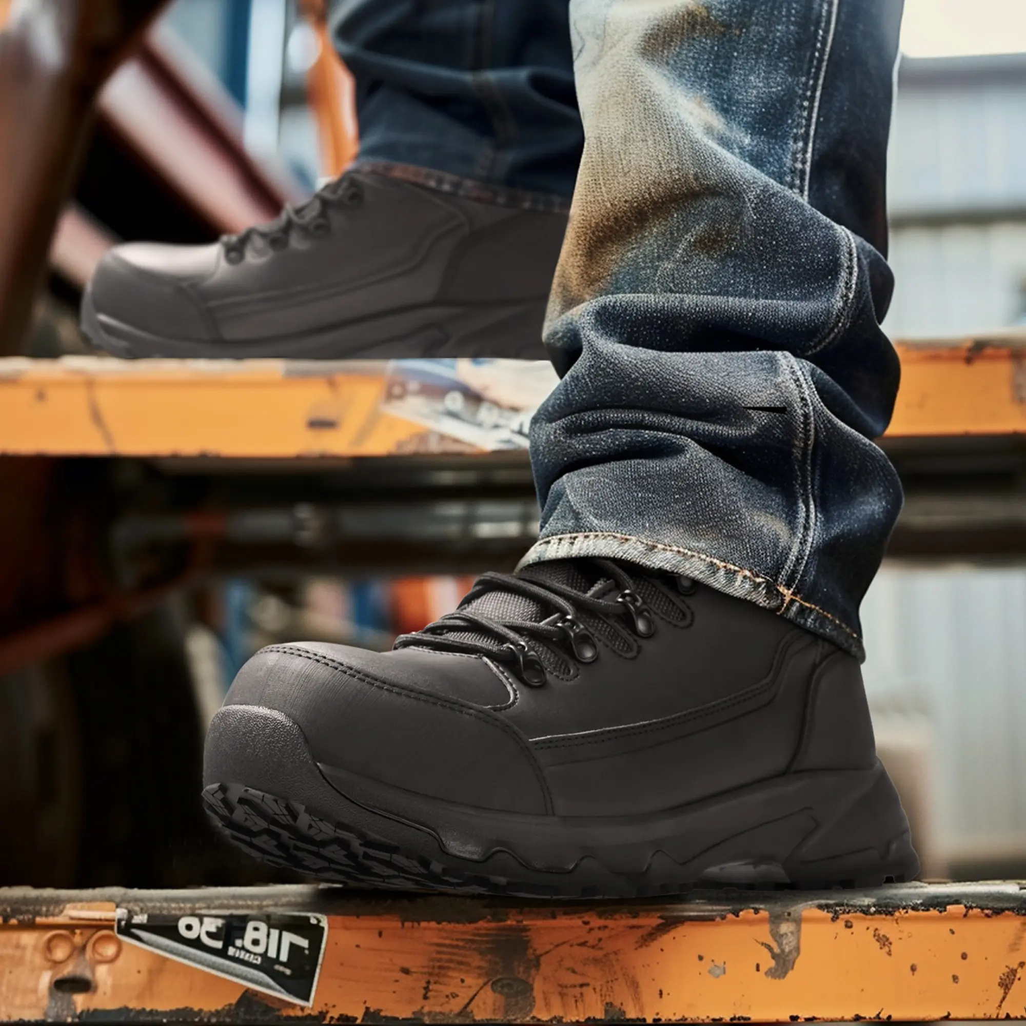 These men’s work boots offer safety features, including a steel toe cap and non-metallic puncture-resistant plate that protects against impacts and sharp objects in challenging work environments. The upper consists of durable materials such as microfiber, rubber, and Oxford cloth so these work boots are made to last. Featuring a breathable mesh lining, EVA insole for cushioning, and foam padding around the ankle, these boots provide support and comfort throughout your workday. Designed for improved grip, these boots feature an MD and rubber outsole with a unique textured pattern for grip on wet or slippery surfaces.