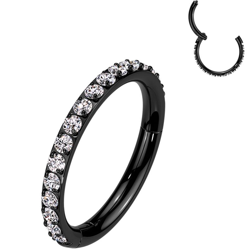 A sparkling beauty; this hinged segment CZ hoop ring is made of hypoallergenic implant grade titanium and can also be worn as can be worn in multiple piercings including the ear as a helix earring, conch earring or as a hinged nose hoop ring.