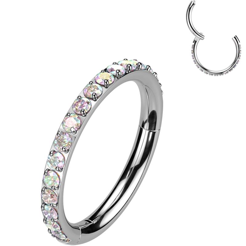Implant grade titanium hinged nose hoop ring piercing. This micro gem nose ring features a segment hinged closure for easy insertion and removal. 18G nose ring hinged segment hoop with dazzling forward facing cubic zirconia CZ stones.