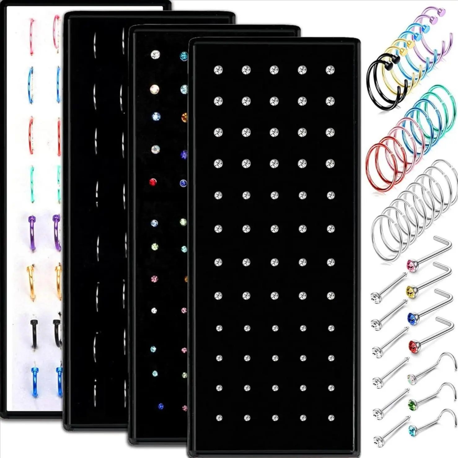 ✨ Discover the ultimate nose piercing collection! Four boxes offer a variety of styles: 60 colorful crystal screw studs, 60 white crystal studs, 40 silver-tone hoops, and 40 colorful hoops. Each set is protected by a box and velvet bag, ensuring safe storage. No worries about damage!