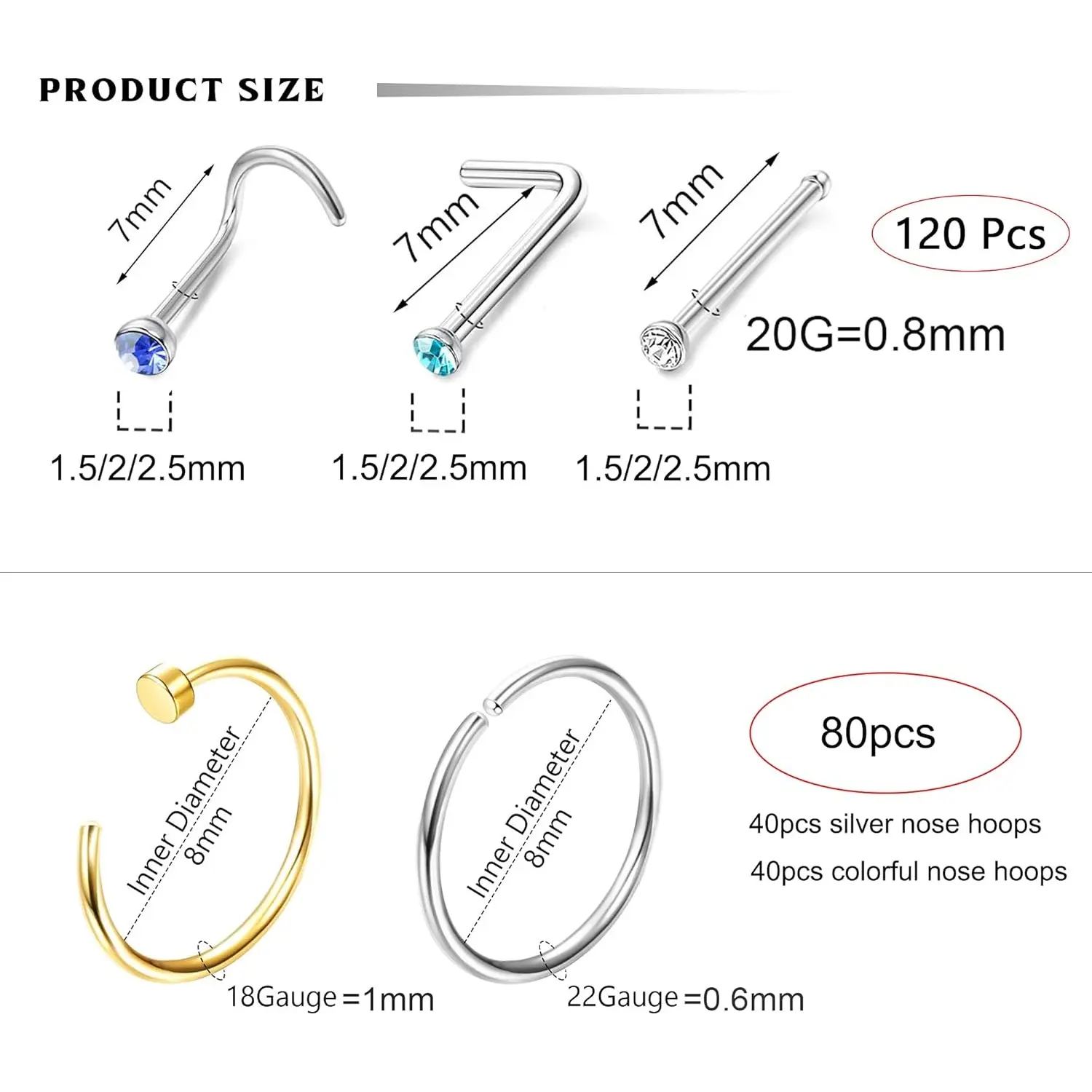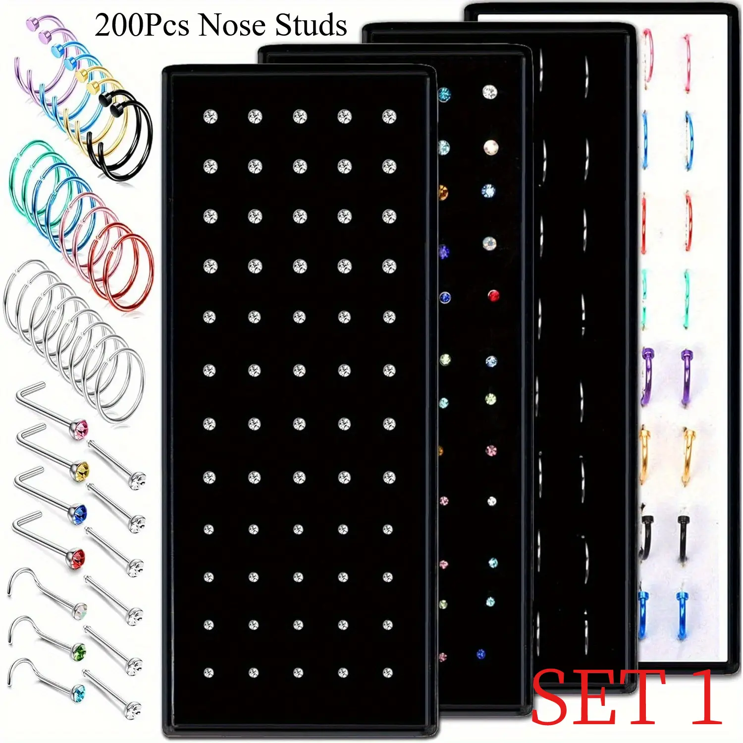 🌟 FIBO STEEL 200 Pcs 316L Stainless Steel Nose Ring Studs Set