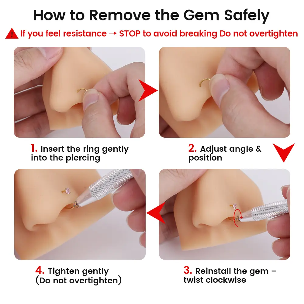 Β·Insertion: Gently twist the nose ring into the piercing, aligning the ends.