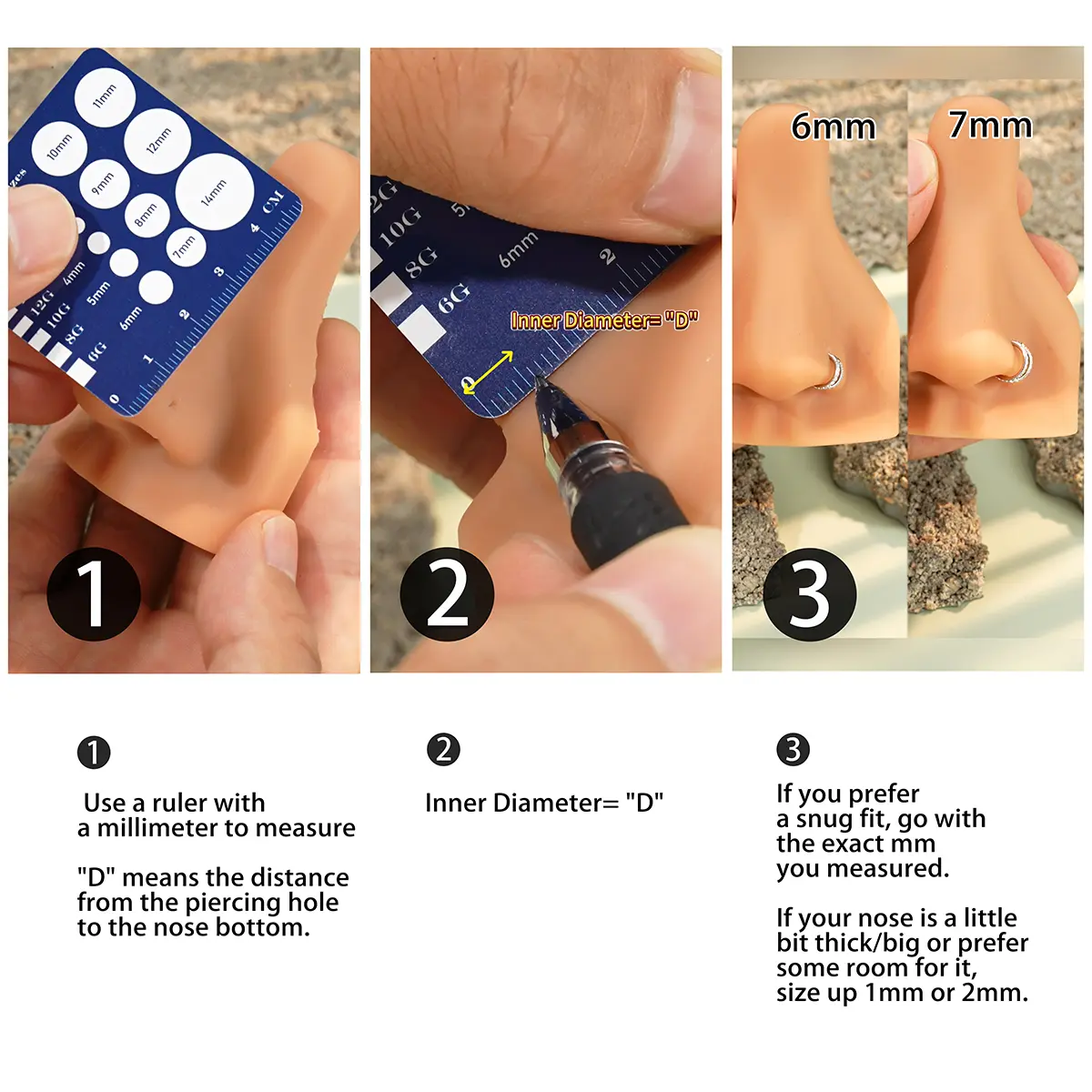 To select the correct nose ring size, consider the inner diameter options: 6mm, 7mm, 8mm, or 9mm. This ensures a perfect fit for your unique style needs. The 20G gauge (0.8mm) bar provides a sleek look suitable for various occasions.